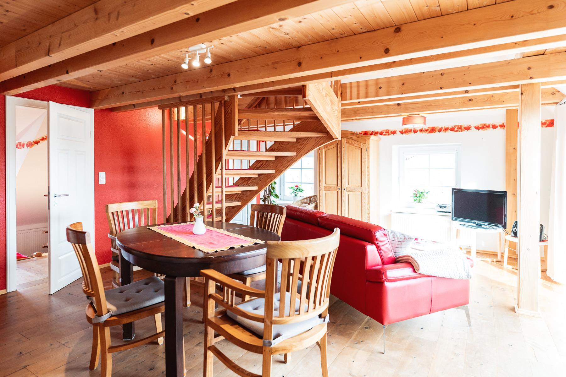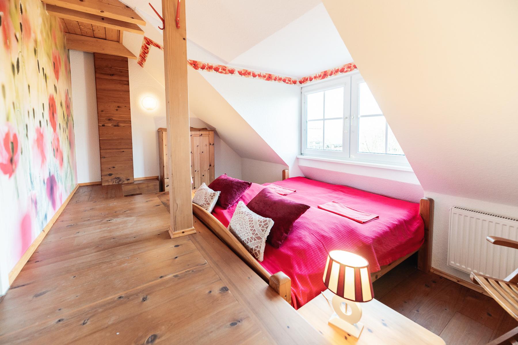 Unsere schöne Ferienwohnung "Mohnblüte" liegt im 1 OG des alten Bauernhauses und verfügt über eine große Loggia Richtung Süden. Die Wohnung besitzt 2 Schlafräume, einen Wohn-/Essbereich, eine Küche und ein Duschbad. Die Küche ist komplett ausgestattet mit allem, was es für einen erholsamen Urlaub benötigt. Waschmaschine und Trockner können kostenpflichtig bei uns mitbenutzt werden.