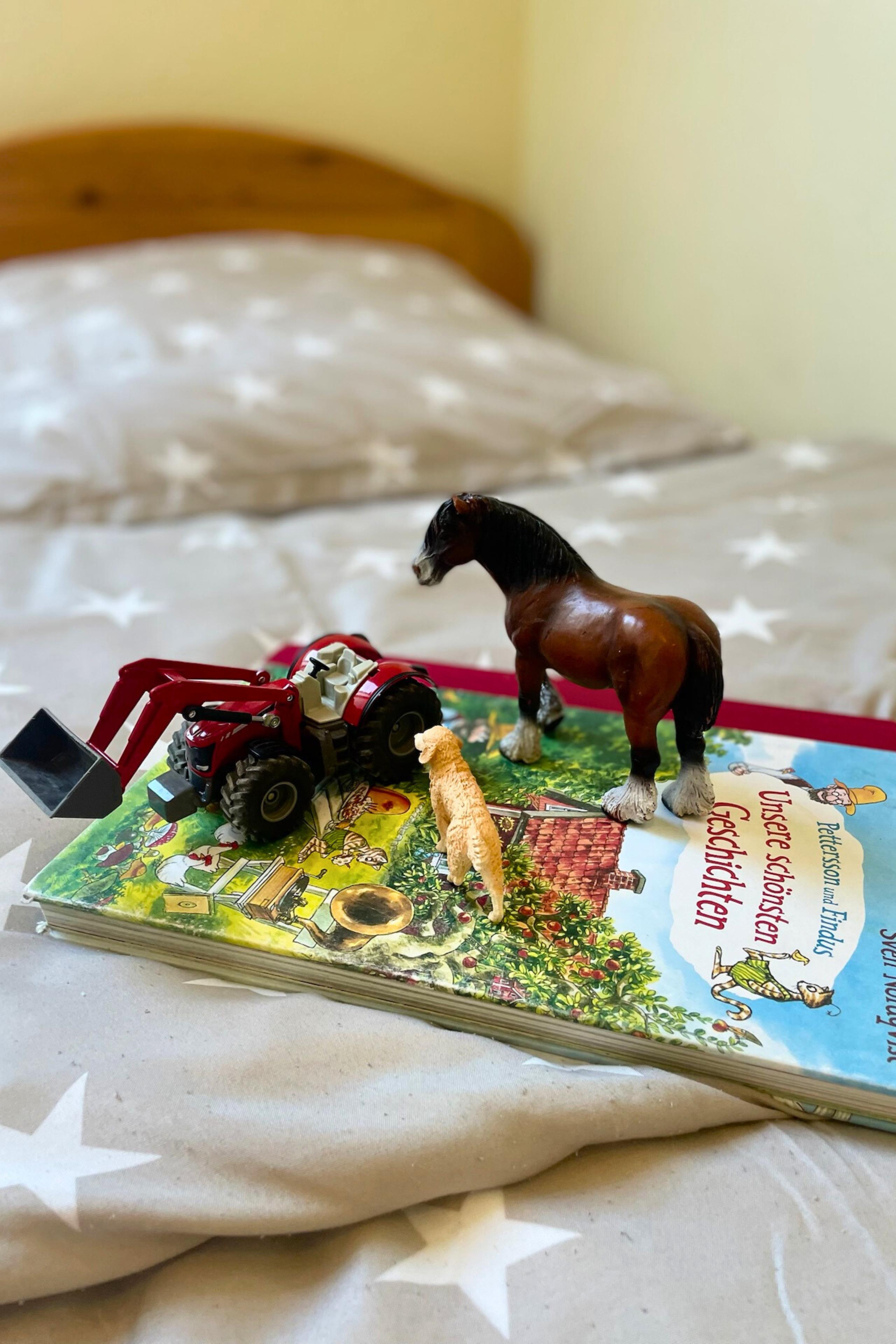 Direkt vom Wohnraum geht’s auf die sonnige Südterrasse mit Strandkorb, Gartenmöbeln und jeder Menge Platz zum Durchatmen. Für kleine Abenteurer und große Entdecker gibt es eine Spielscheune, ein riesiges Trampolin, einen Bolzplatz und viele weitere Spielgeräte auf dem Hof – Spaß garantiert!