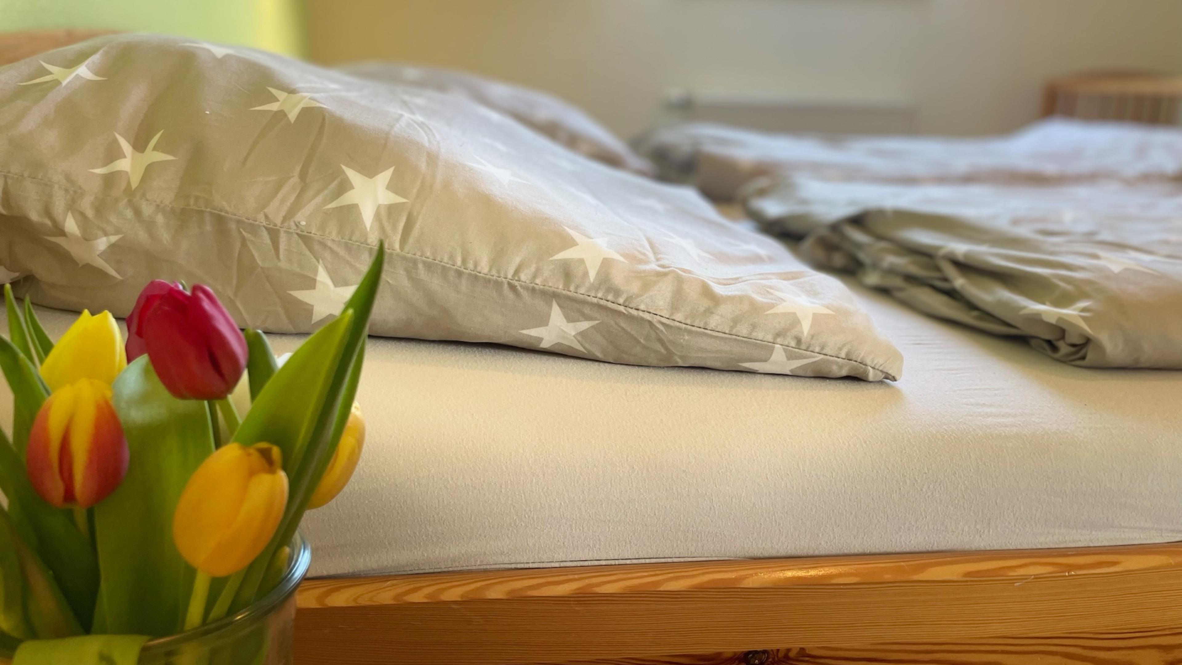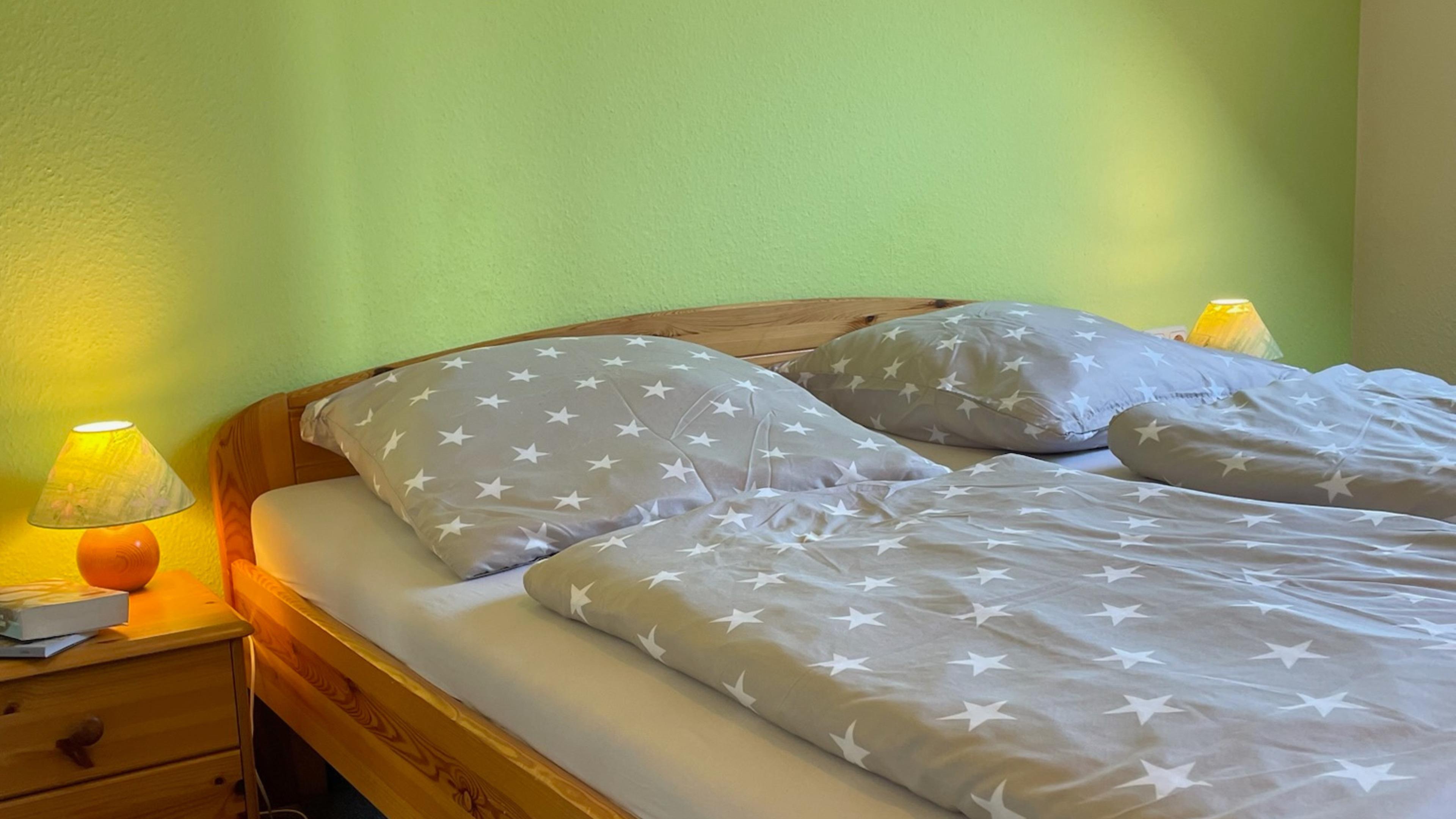 Im Obergeschoss gibt’s gleich zwei Schlafzimmer: eines mit großem Doppelbett, das andere mit zwei Einzelbetten – perfekt für Familien oder kleine Gruppen.