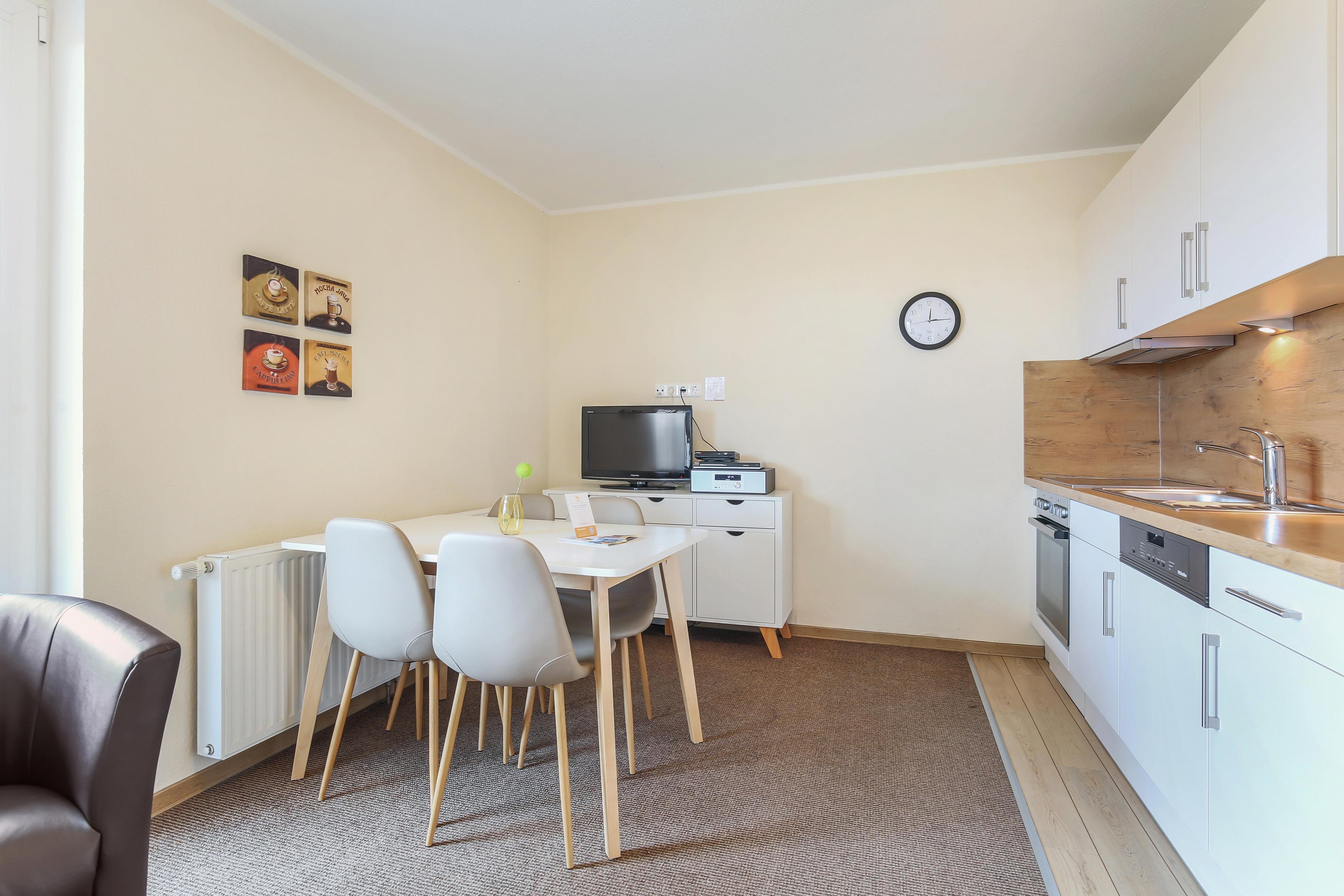 Wohnung "An Küche" (38qm): Die Wohnung befindet sich im Erdgeschoss des "Alten Backhaus". Sie hat ein separates Schlafzimmer, Duschbad mit WC, einen Wohnraum mit voll ausgestatteter Küche, Esstisch, Sofagarnitur, Flachbild-TV, DVD-Player usw. und eine Südterrasse mit direktem Zugang zum Spielplatz und Blick auf die Ponyweide und die Ostsee. Die modern renovierte Wohnung ist vom DTV mit vier Sternen ausgezeichnet.