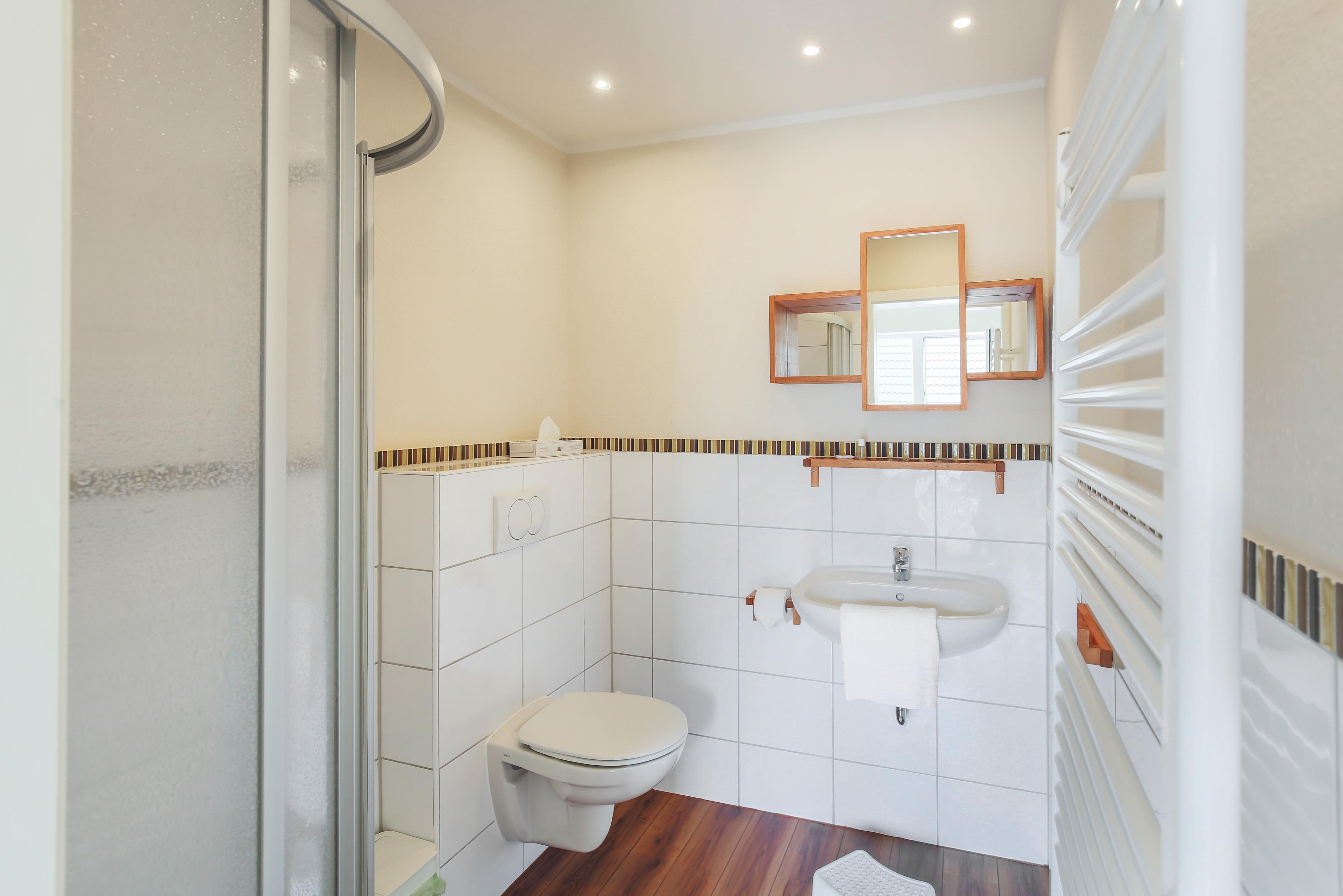 Wohnung "Nord Ost" (40qm): Die Wohnung befindet sich im ersten Stock des Bauernhauses. Sie hat ein separates Schlafzimmer, Duschbad mit WC, einen Wohnraum mit voll ausgestatteter Küche, Esstisch, Sofagarnitur (Schlafsofa), Doppelbett, Flachbild-TV, DVD-Player usw. und einen Südbalkon mit Blick auf den Spielplatz, die Ponyweide und die Ostsee. Die modern renovierte Wohnung ist vom DTV mit vier Sternen ausgezeichnet.