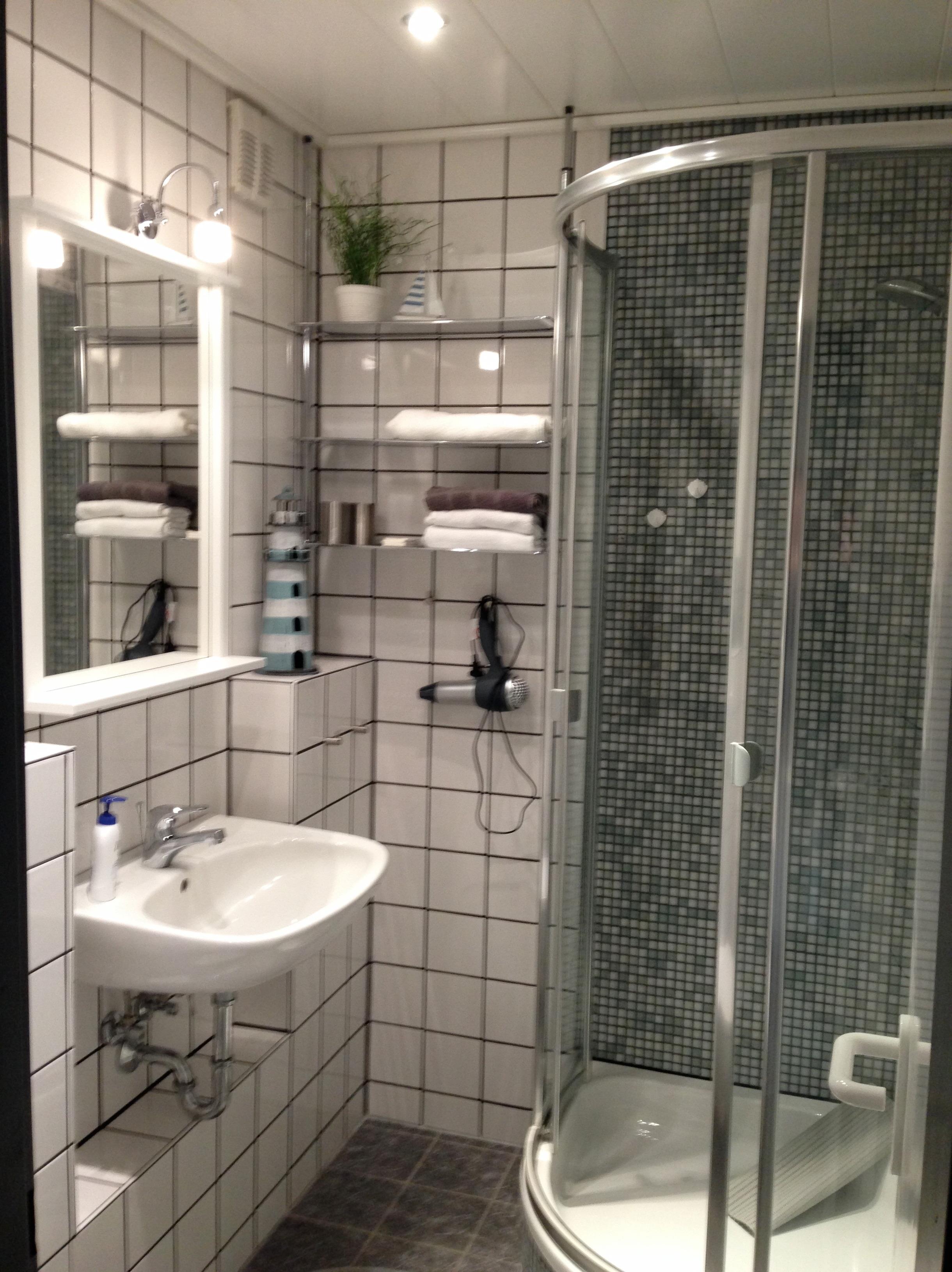 Im modernen Badezimmer finden Sie ein Hänge-WC, einen Fön und eine große Dusche.