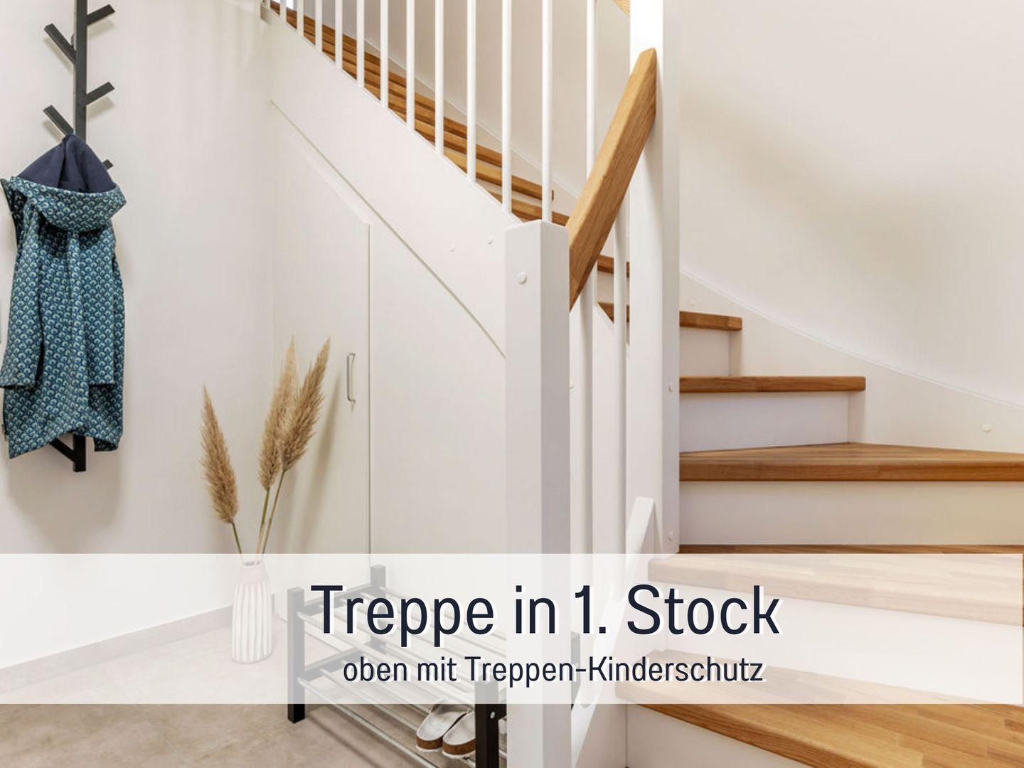 Über die schicke Eichenholztreppe gelangt ihr zu den zwei Schlafzimmern im Obergeschoss: