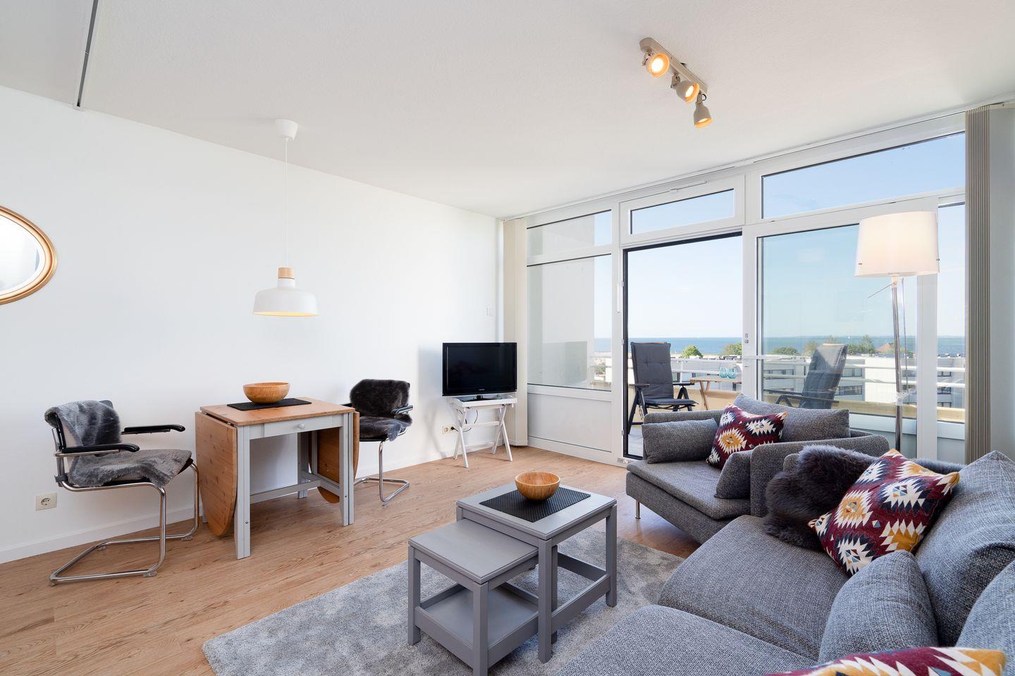 Moderne 1-Zimmer-Ferienwohnung mit Balkon und Ostseeblick am Südstrand Burgtiefe auf Fehmarn.