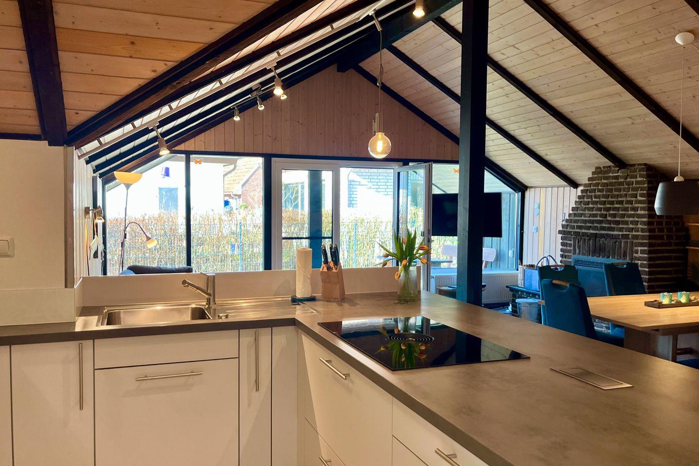 Im hellen Wohnzimmer mit Kamin und großer Fensterfront verbringen Sie gemeinsame Abende voller Wärme und Ruhe. Die offene Küche mit angrenzendem Essbereich bietet alles, was Sie für entspannte Mahlzeiten und Familienmomente brauchen.