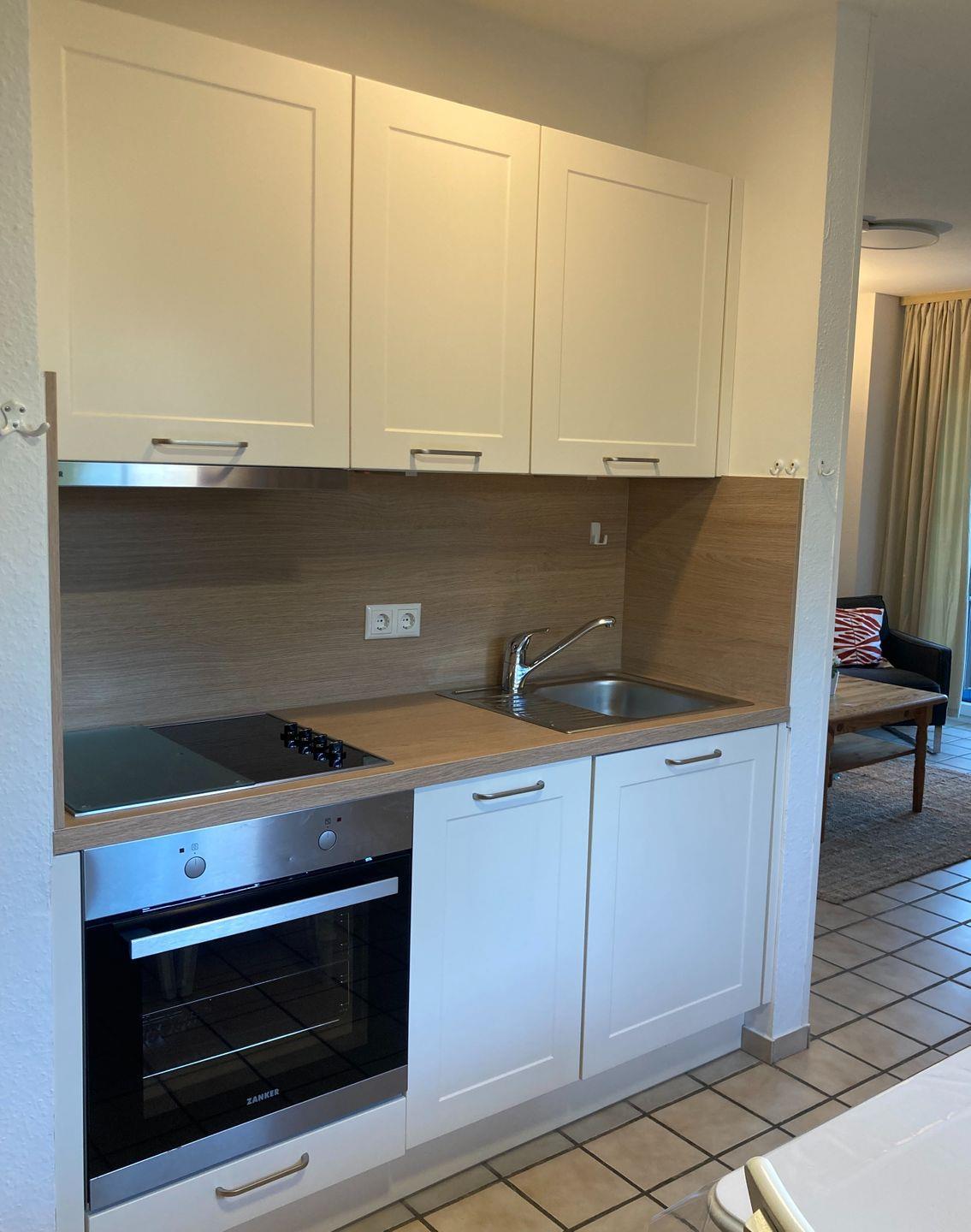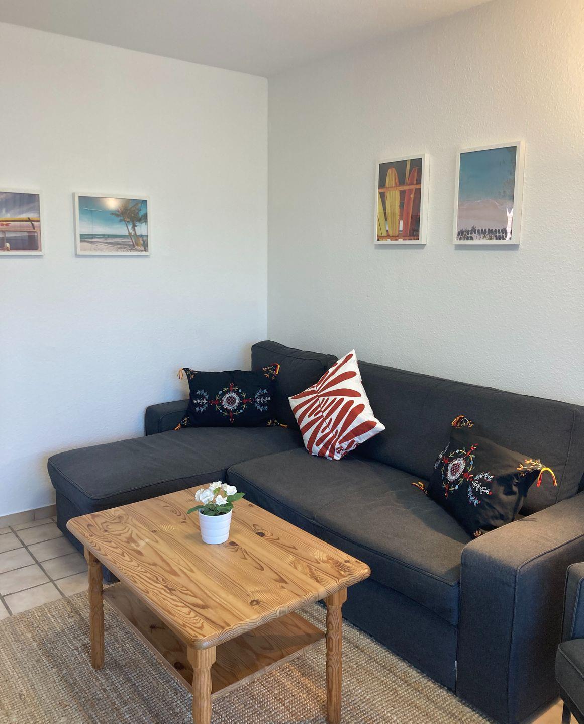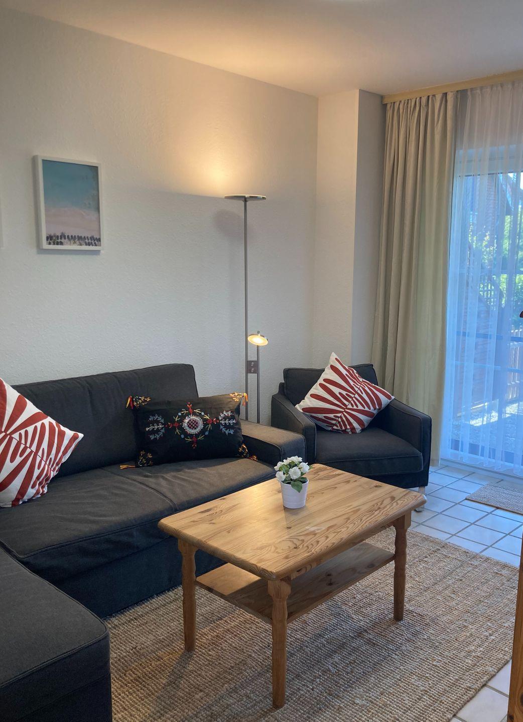 Die Wohnung bietet ein helles Wohnzimmer mit gemütlicher Sitzecke, eine voll ausgestattete Küche mit Essbereich, ein Schlafzimmer mit Doppelbett und ein modernes Duschbad.