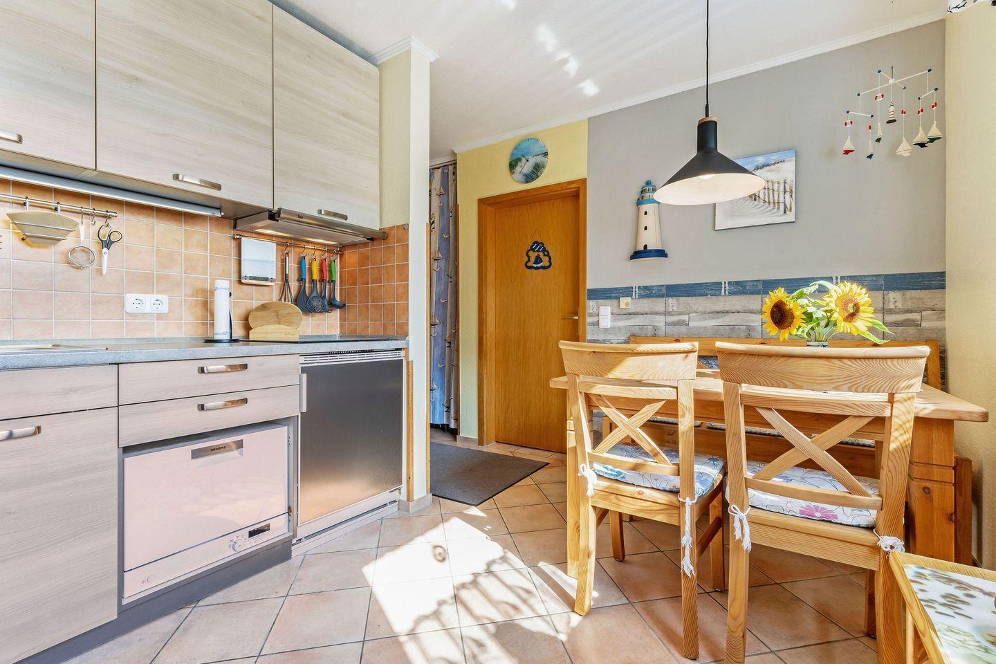 Ideal für zwei Personen (plus Baby bis 3 Jahre) und auch Ihr Hund ist herzlich willkommen! Die Wohnung ist stilvoll eingerichtet und verfügt über ein gemütliches Wohnzimmer mit Sofa und Sessel, perfekt für entspannte Abende nach einem Tag am Meer. In der gut ausgestatteten Küche mit angrenzendem Essbereich macht das Kochen im Urlaub richtig Freude. Das separate Schlafzimmer mit komfortablem Doppelbett und das moderne Duschbad sorgen für erholsamen Schlaf und einen entspannten Start in den Tag.