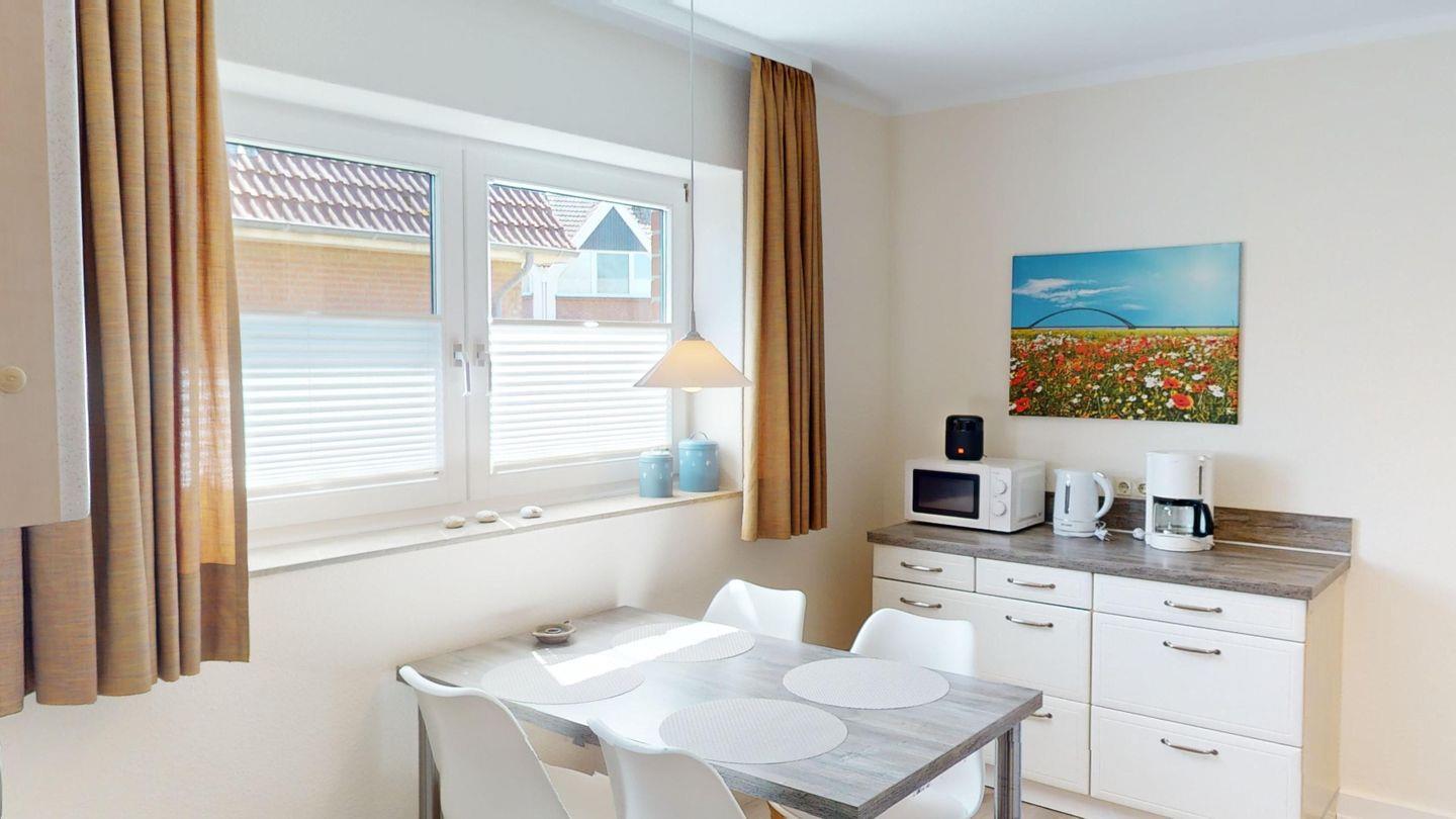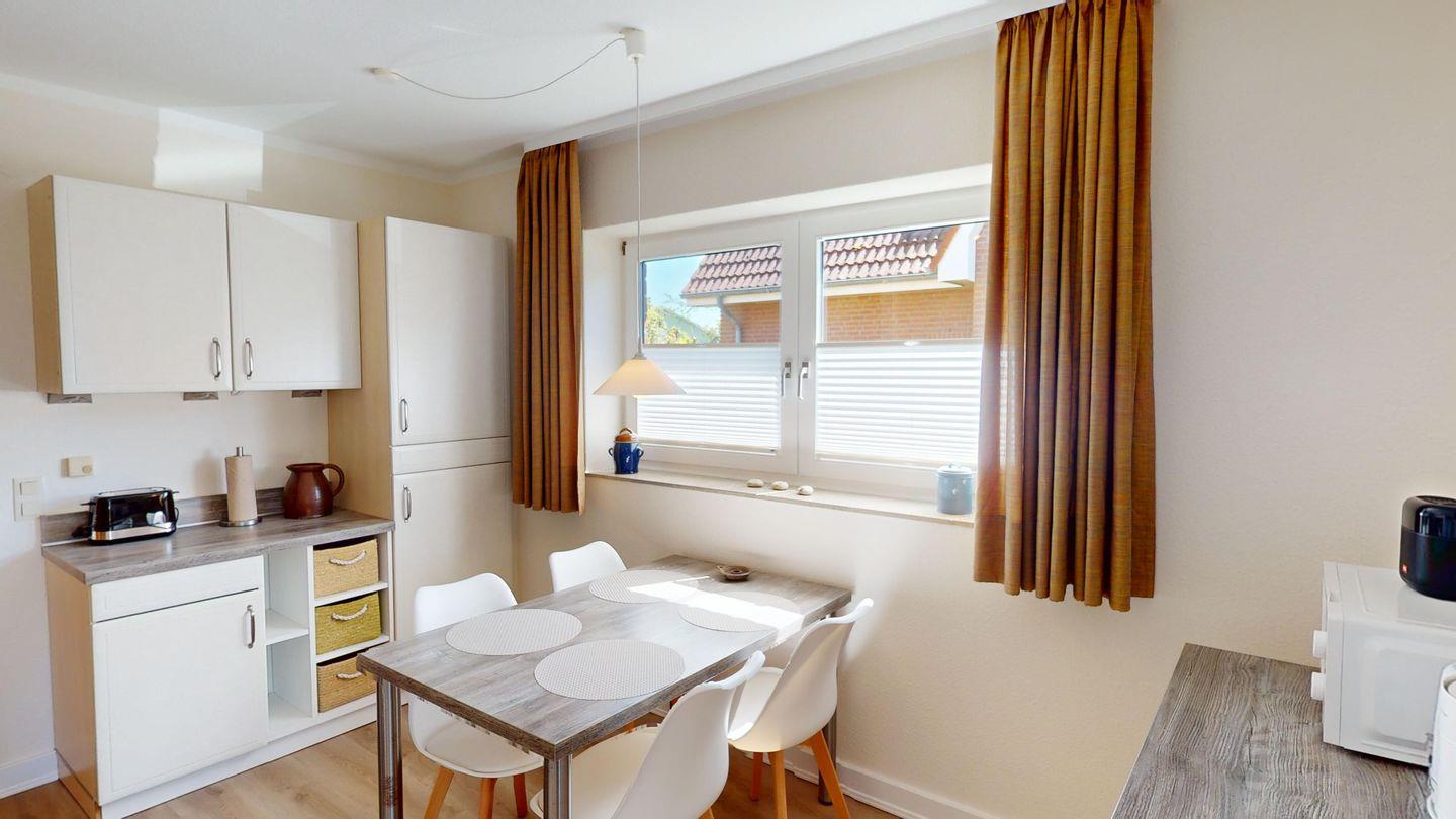 Die komplett ausgestattete Küche mit anschließendem, stilvollen Essbereich macht gemeinsame Mahlzeiten zum Genuss. Im separaten Schlafzimmer wartet ein komfortables Doppelbett mit zwei hochwertigen "bett1"-Matratzen (90x200 cm) – wählbar in zwei Härtegraden für individuellen Schlafkomfort. Das moderne Duschbad rundet das Wohlfühlpaket ab.