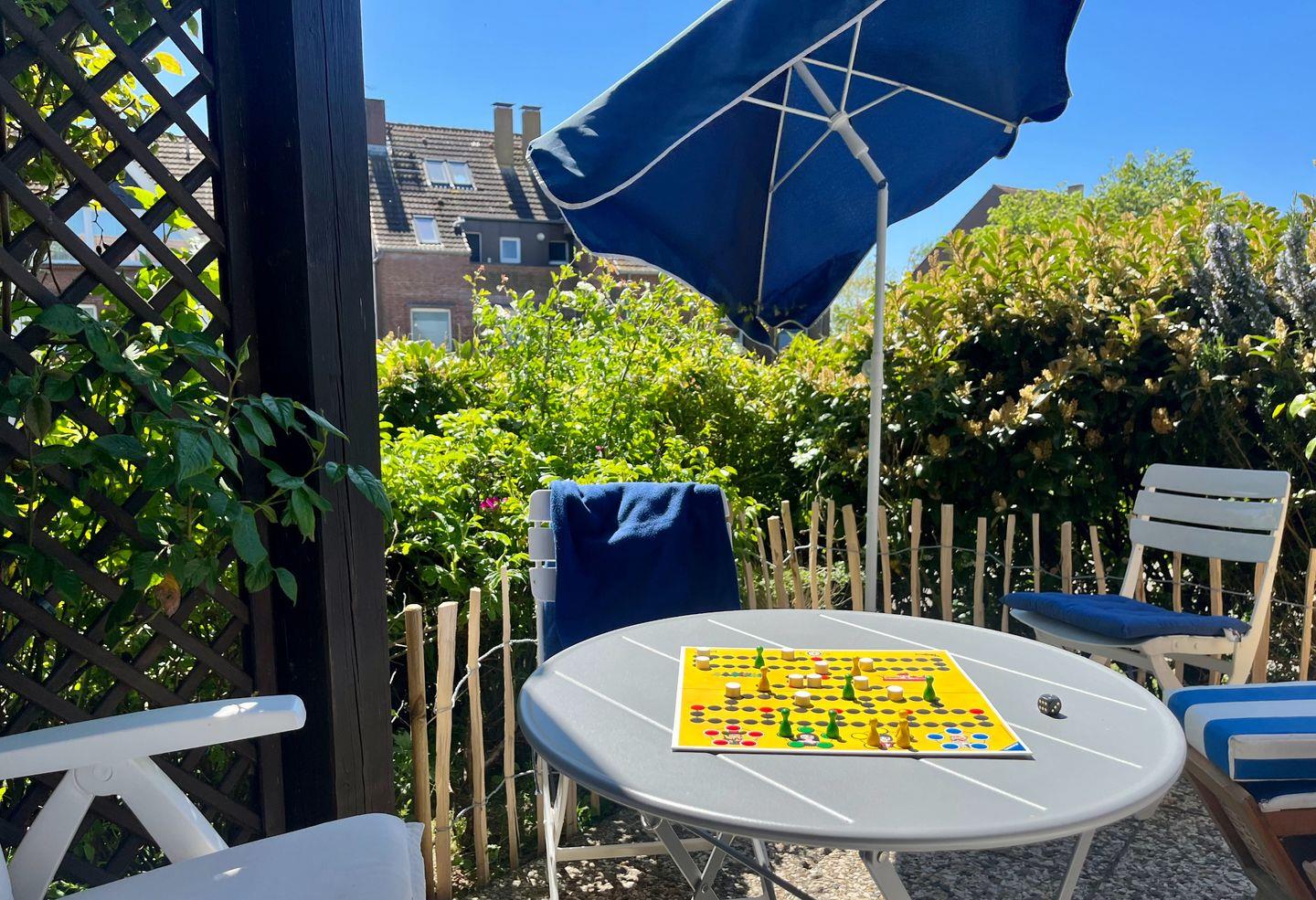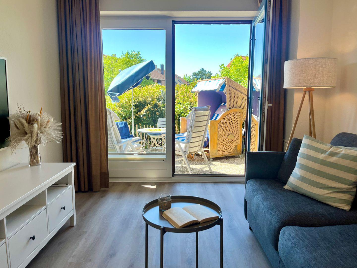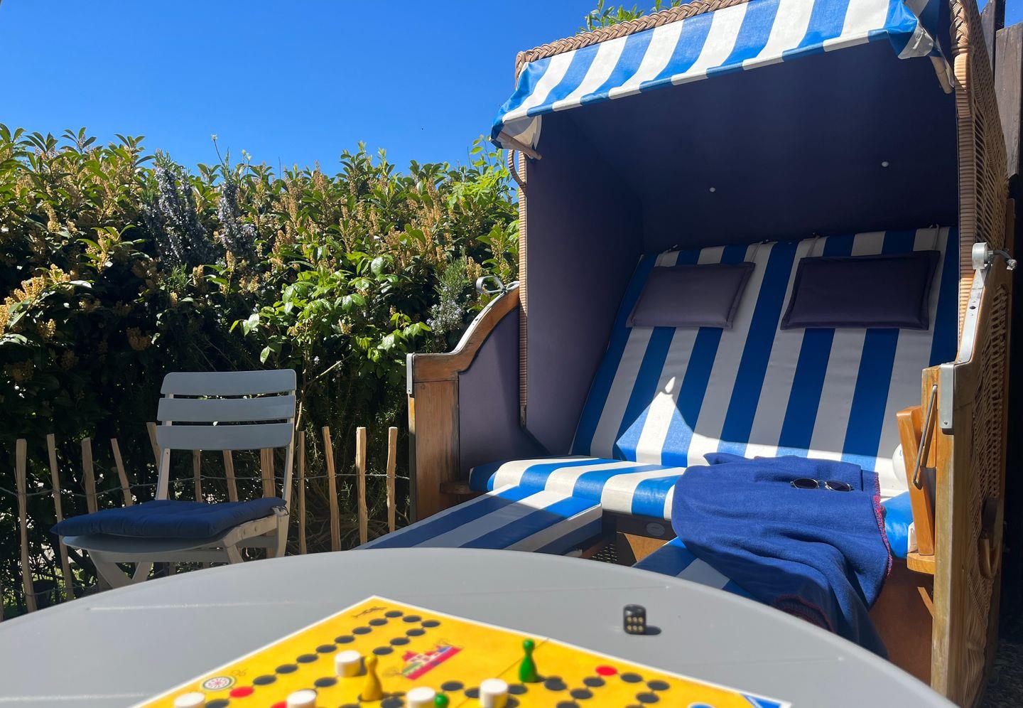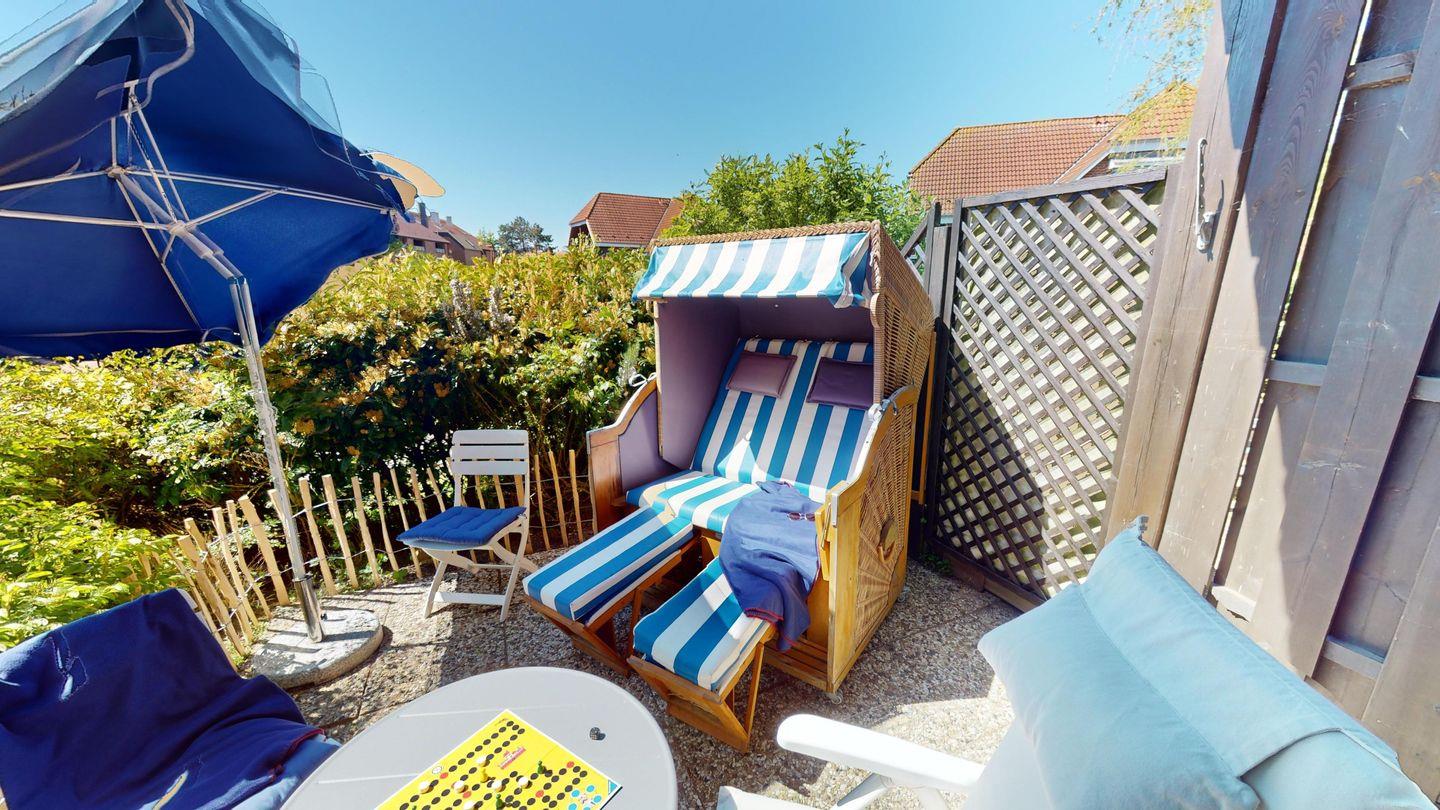 Ein echtes Highlight: die sonnige Terrasse in Süd/West-Lage mit eigenem Strandkorb – genießen Sie hier die frische Meeresluft, Sonnenuntergänge und entspannte Stunden mit einem guten Buch oder einem kühlen Getränk.