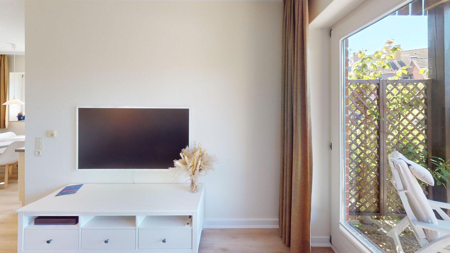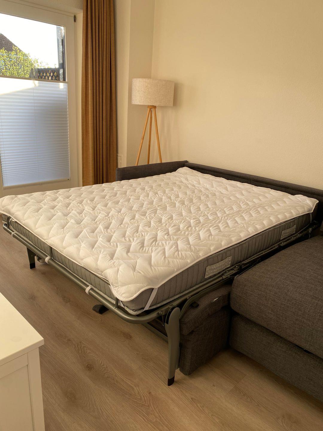 Das gemütliche Wohnzimmer ist nicht nur ein Ort zum Entspannen, sondern wird mit dem hochwertigen Schlafsofa (inkl. 1,40 m breiter Matratze) zur bequemen Schlafmöglichkeit für zwei Personen. Für Unterhaltung am Abend sorgt ein großer 55-Zoll Smart-TV – ob Familienfilm, Lieblingsserie oder Streaming-Abenteuer.