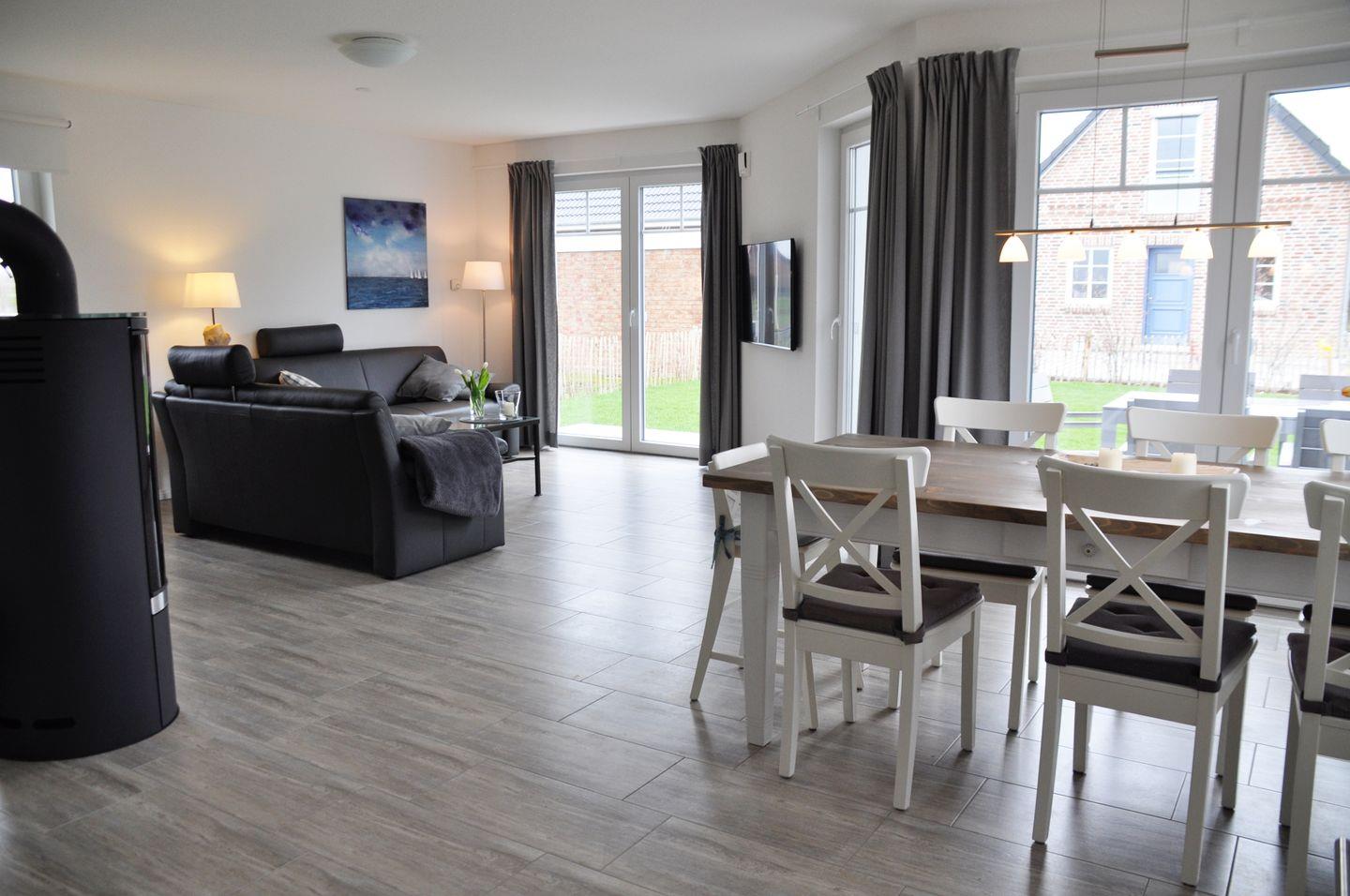 Der großzügige Wohnbereich mit knisterndem Kaminofen, offener Küche, gemütlicher Sofaecke, TV und einem einladenden Essplatz bildet das Herzstück des Hauses – ideal für gemeinsame Stunden mit Familie oder Freunden. Die drei Schlafzimmer sind praktisch und komfortabel eingerichtet: ein Zimmer mit Doppelbett und TV, eines mit zwei Einzelbetten und eines mit einem Etagenbett – perfekt für Groß und Klein.