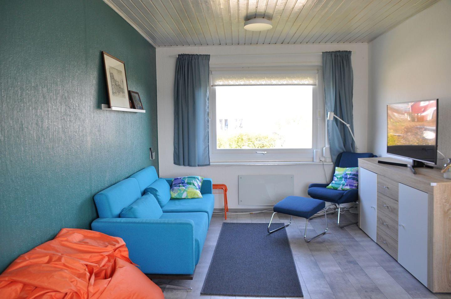 Über die Außentreppe erreichen Sie das lichtdurchflutete Obergeschoss, in dem sich ein stilvoll eingerichtetes Schlafzimmer mit Doppelbett, ein offener Wohnbereich mit moderner Küche und Essplatz, ein großzügiges Wohnzimmer sowie ein elegantes Duschbad befinden. Hier trifft nordischer Charme auf modernes Wohngefühl.