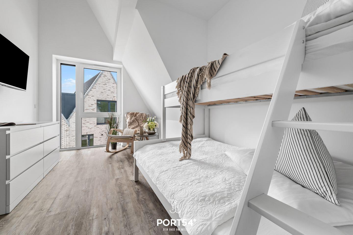 * Zweites Schlafzimmer mit einem Etagenbett, wobei die obere Matratze 90x200 cm misst und die untere 120x200 cm