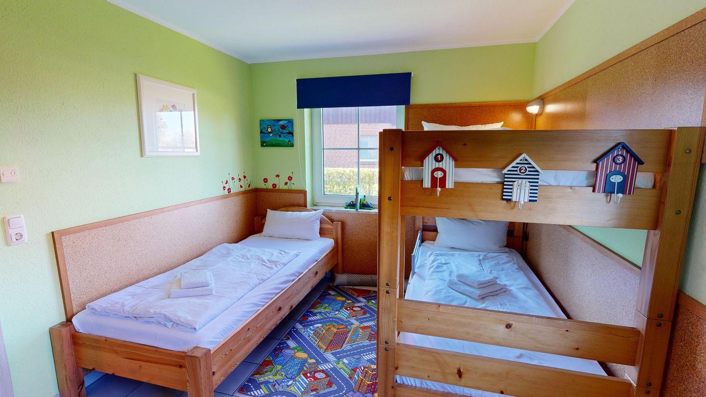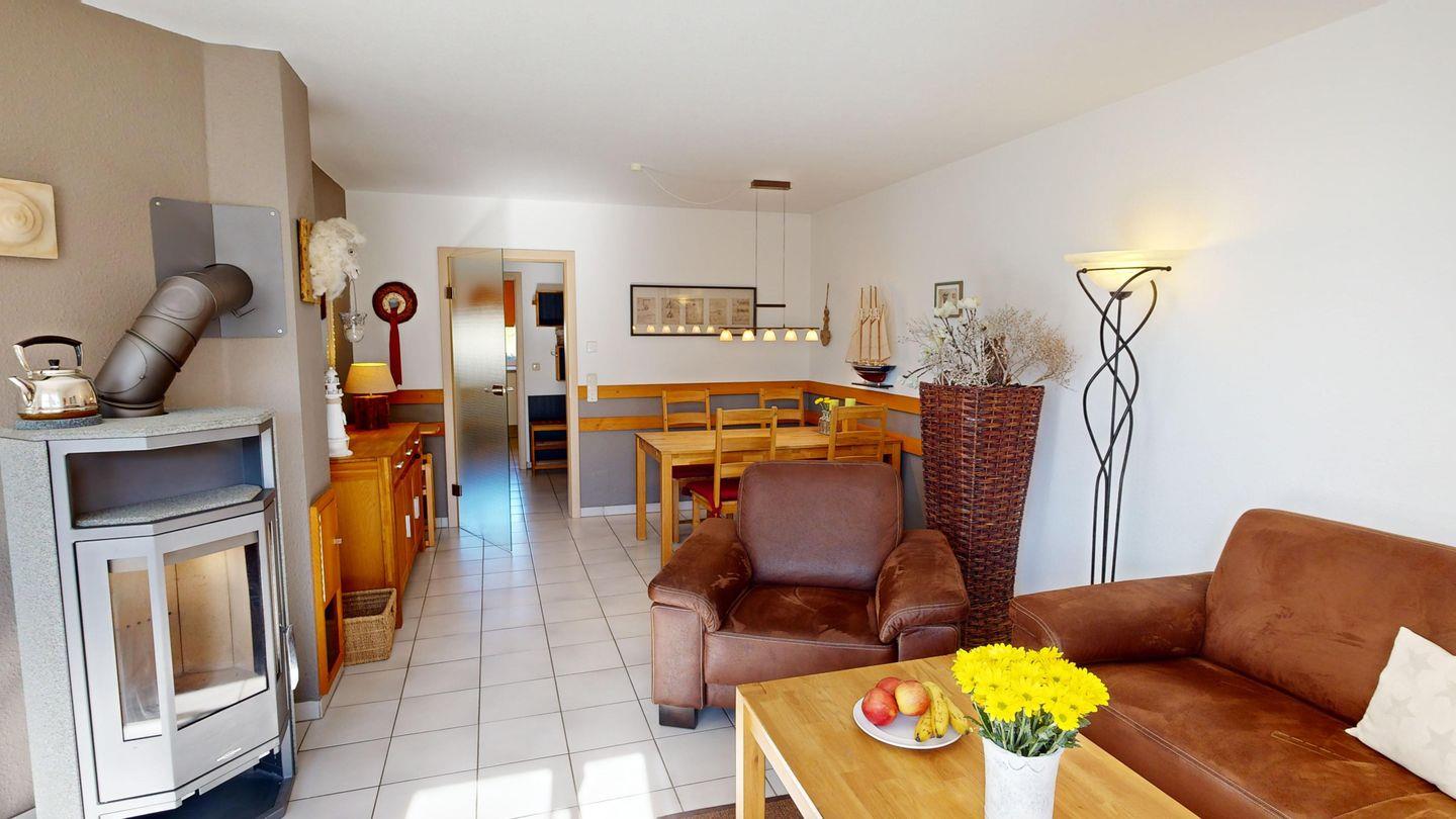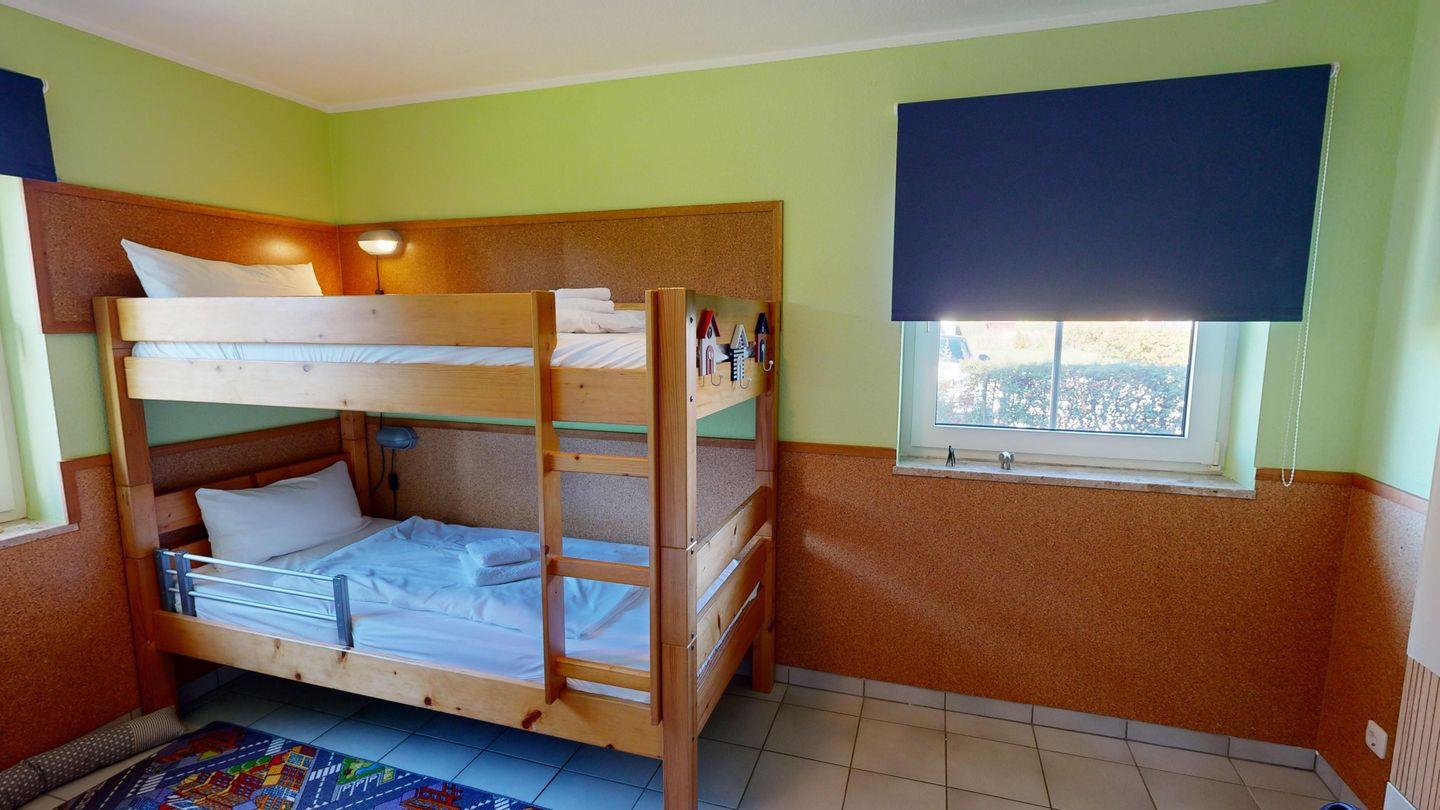 Die Wohnung begeistert mit zwei liebevoll eingerichteten Schlafzimmern: Ein behagliches Doppelbett für die Eltern und ein separates Kinderzimmer mit Etagen- und Einzelbett – ideal für den Familienurlaub. Im Mittelpunkt steht der offene Wohn- und Essbereich mit Kamin, der auch an kühleren Tagen für eine warme und entspannte Atmosphäre sorgt.