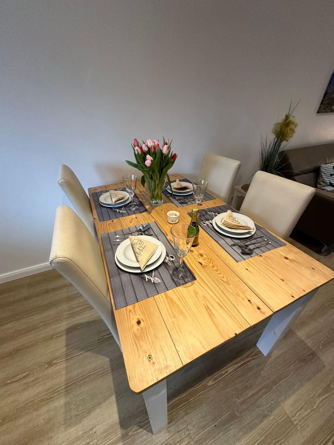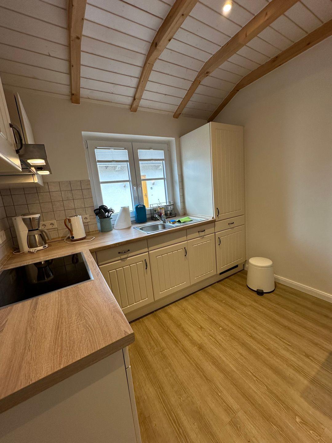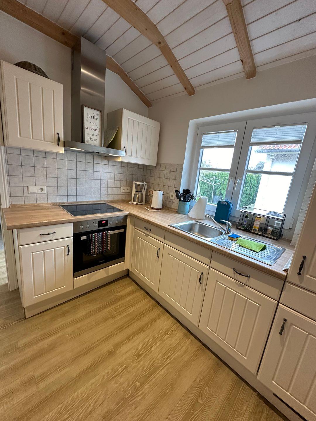 Die Wohnküche bietet neben einem gemütlichem Essbereich einen Herd/ Backofen, Geschirrspülmaschine, Filter Kaffeemaschine, elektrischer Wasserkocher, Toaster etc.
