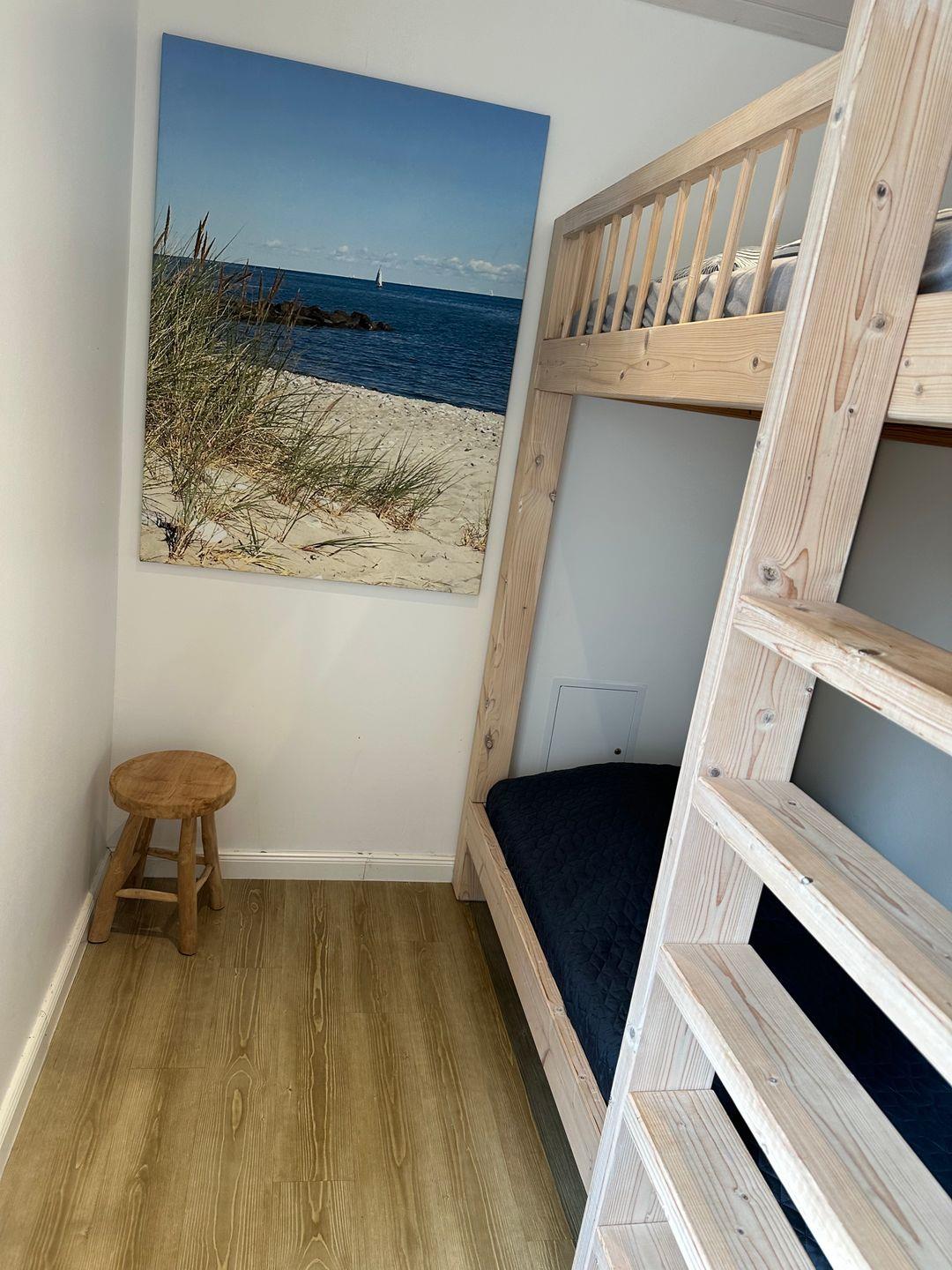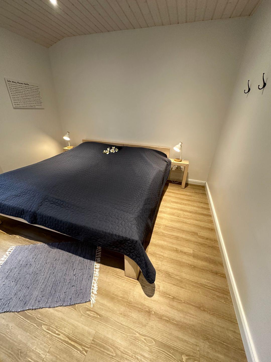Das Ferienhaus verfügt über zwei Schlafzimmer. Ein Elternschlafzimmer mit einem Doppelbett, sowie einem Kinderzimmer mit einem Etagenbett. Außerdem befindet sich ein Badezimmer mit Dusche, WC und Waschbecken im Ferienhaus.