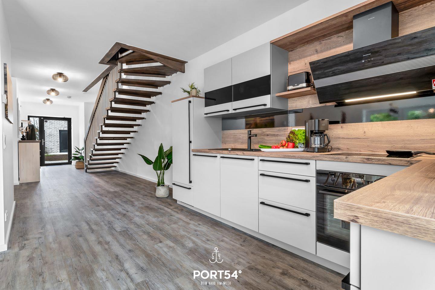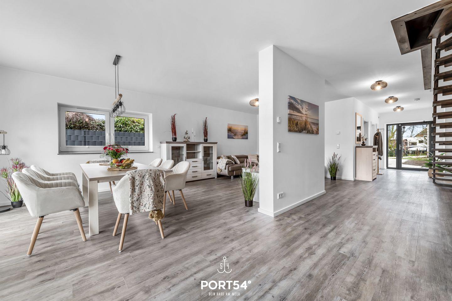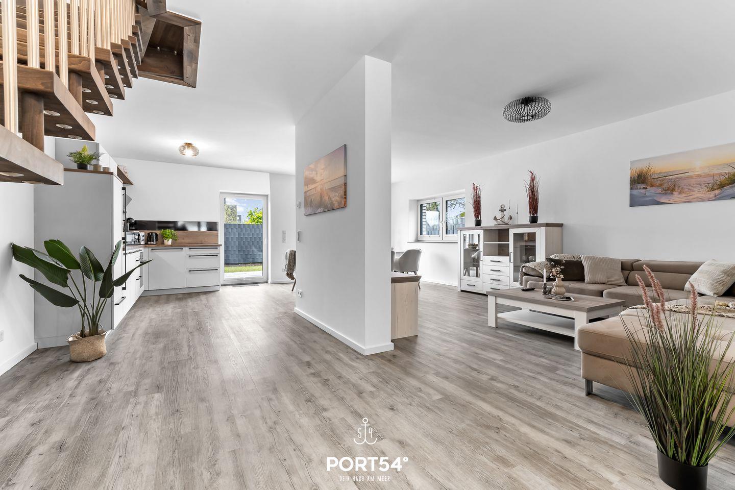 Im Erdgeschoss befindet sich der Koch- und Essbereich sowie das lichtdurchflutete Herz des Hauses – der Wohnbereich mit Zugang zur Terrasse.