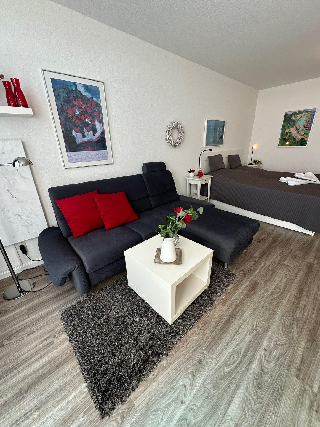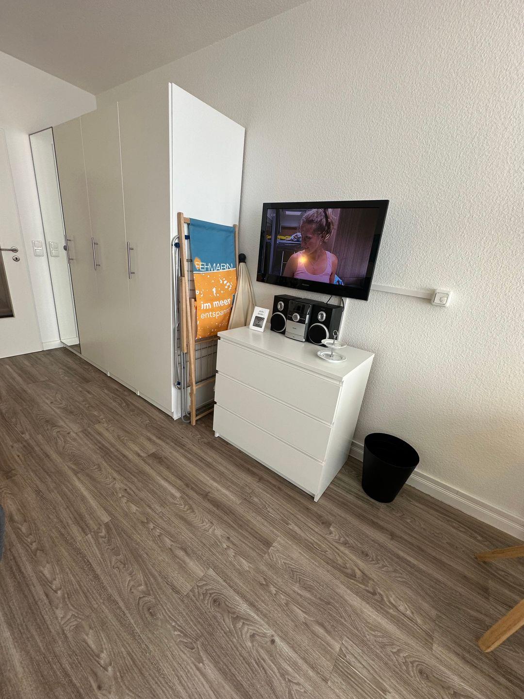 Doppelbett (180x200) mit LED-Leselampen, Flat Screen-TV, Schlafsofa, Esstisch Kleiderschrank, WLAN