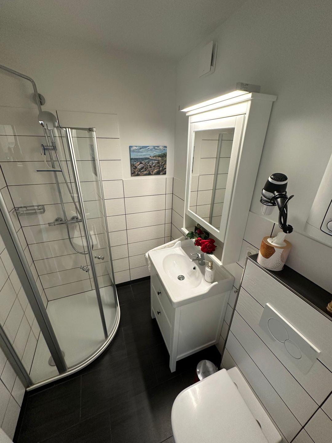 Dusche, Waschbecken, Spiegel, gute Beleuchtung, WC, Regal, Fön