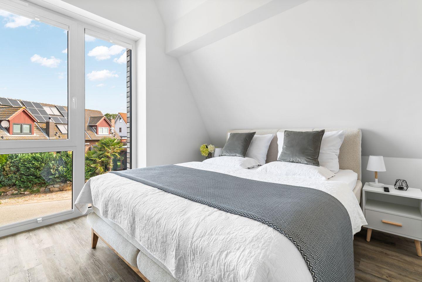 Fühl Dich wie Zuhause im Ferienhaus „Donnerkeil“! Auf zwei Etagen und 130 m² Wohnfläche bietet das Haus neben drei Schlafzimmern, zwei Badezimmern, einem geräumigen Wohn- und Essbereich mit angrenzender offener Küche auch eine vollmöblierte Sonnenterrasse. Im Erdgeschoss befindet sich der Koch- und Essbereich sowie das lichtdurchflutete Herz des Hauses – der Wohnbereich mit Zugang zur Terrasse. Im Obergeschoss erwarten Dich drei Schlafzimmer sowie das luxuriöse Badezimmer mit finnischer Sauna. Eines der Schlafzimmer verfügt über ein großes Doppel-Boxspringbett für zwei Personen. Im zweiten Schlafzimmer befindet sich ein Etagenbett mit einer Liegefläche von 90x200 cm oben und unten. Im dritten Schlafzimmer findest Du zwei Einzelbetten mit den Maßen 90x200 cm.