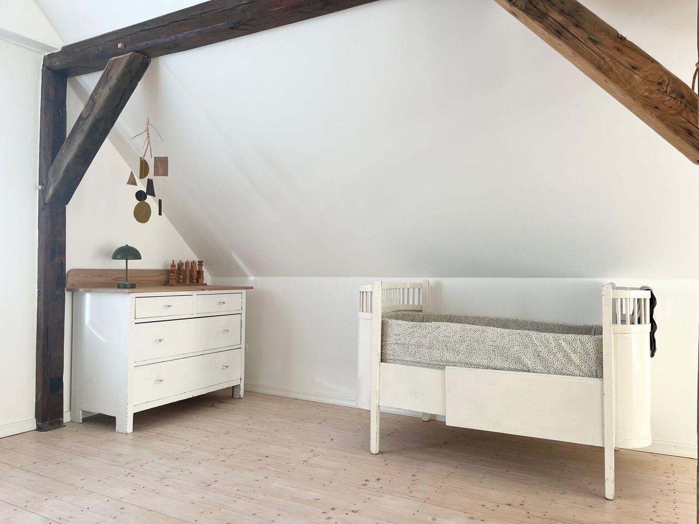 Im Obergeschoss befindet sich ein weiterer großzügiger Raum, ausgestattet mit einem Doppelbett, einem Einzelbett und einem Babybett. Zudem gibt es eine kleine Sitzecke mit einem zusätzlichen Fernseher, die für gemütliche Stunden sorgt.