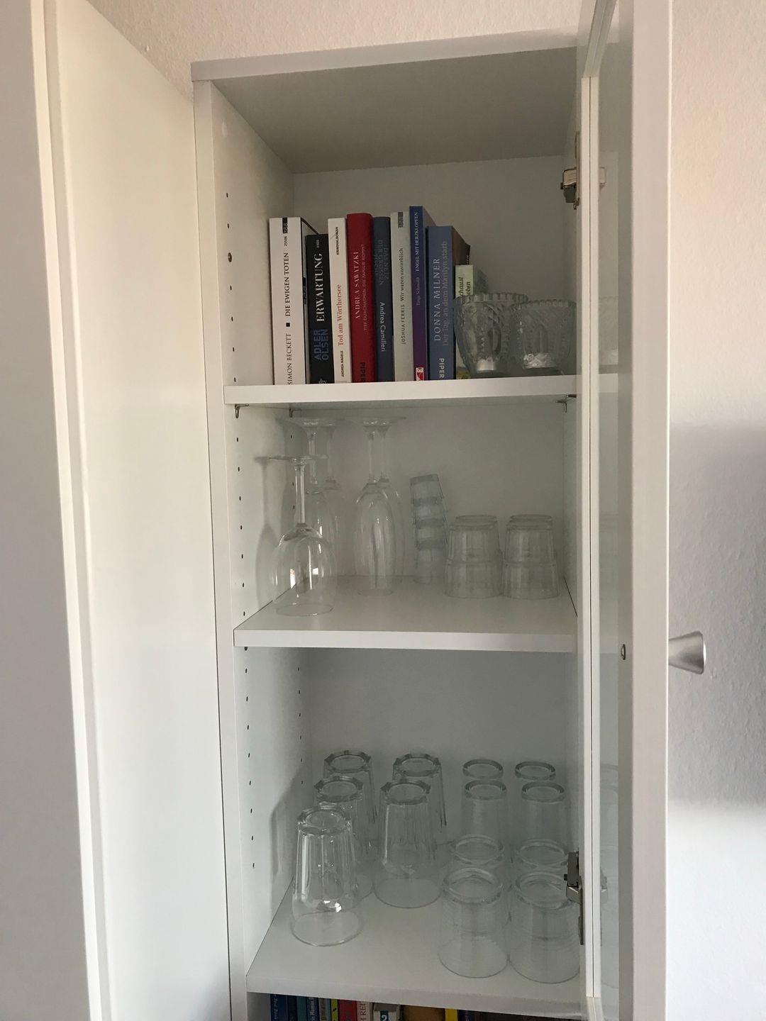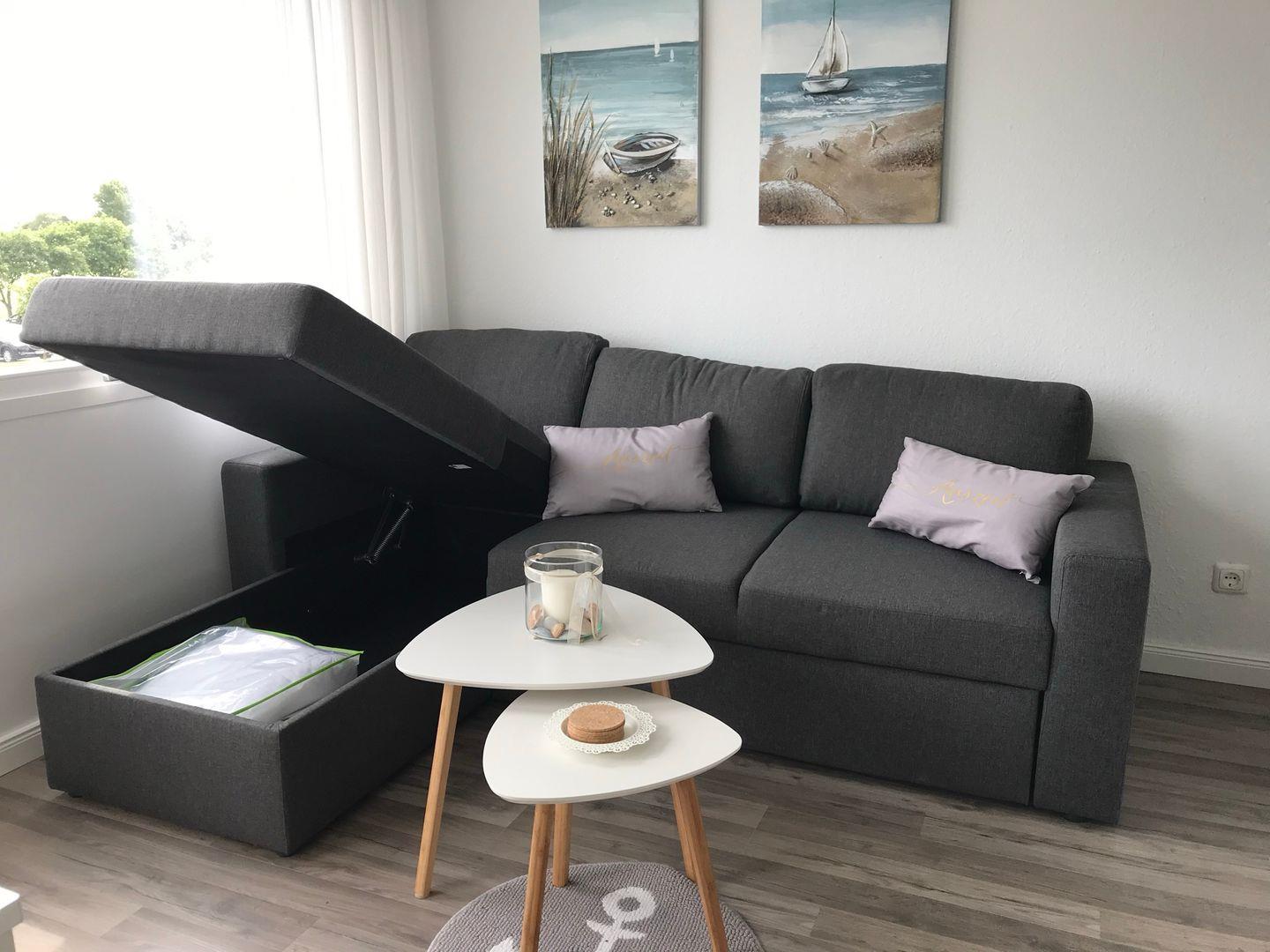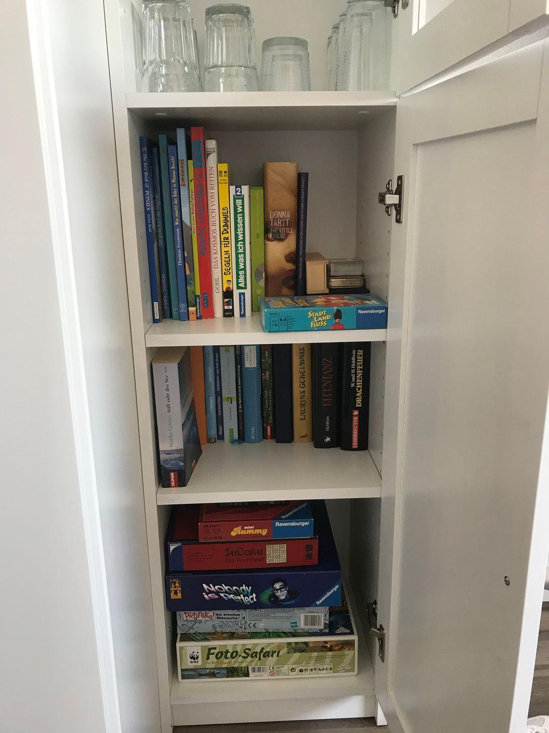 Doppelbett (180x200), Flat Screen-TV, Schlafsofa (150x200) inkl. Bettkasten, Esstisch, Kleiderschrank, Spiele, Bücher