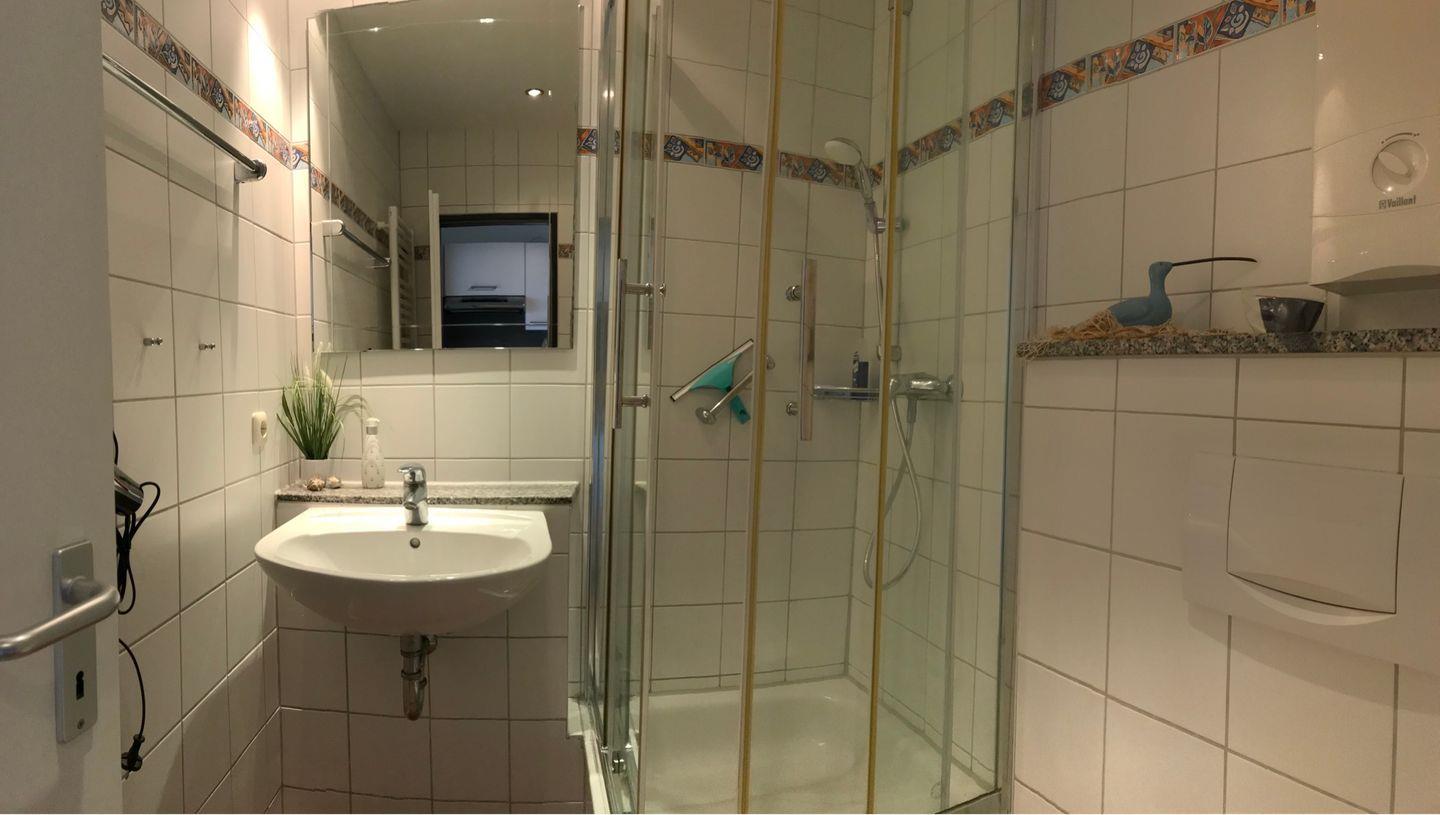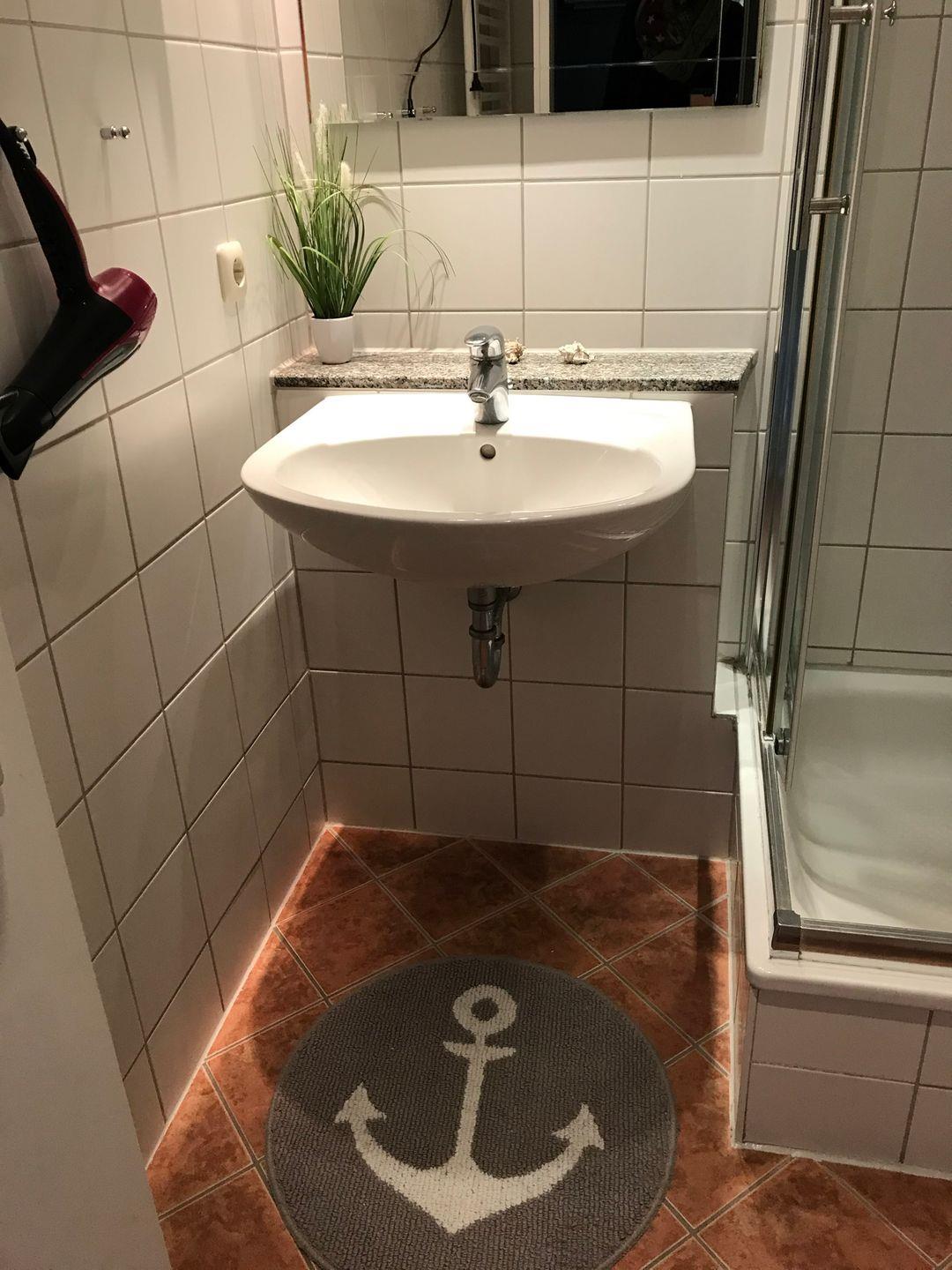 Waschbecken, Spiegelschrank, Dusche, WC, gute Beleuchtung, Fön