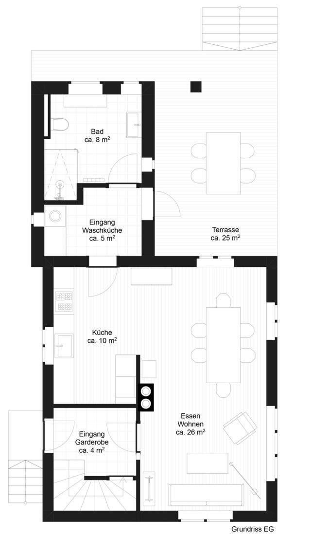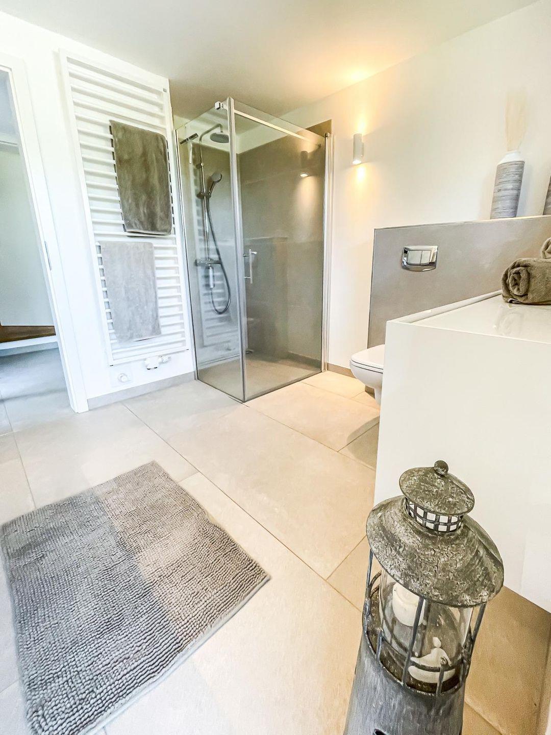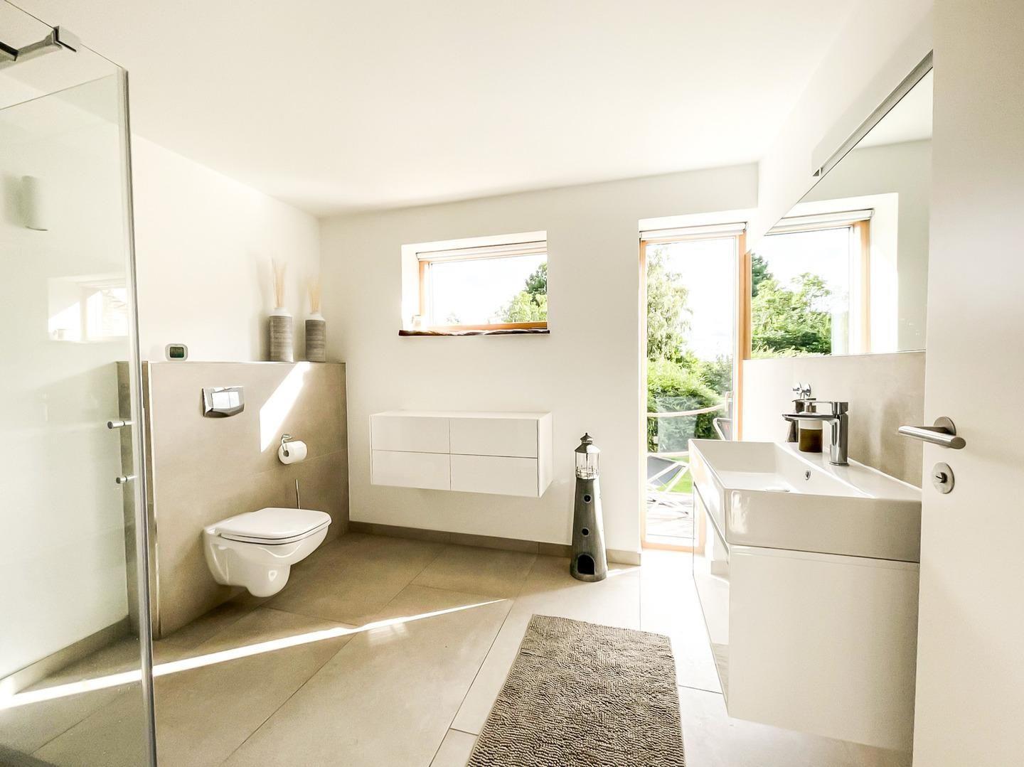 Das moderne, großzügige Bad ist ebenfalls im Erdgeschoss untergebracht und ist für diejenigen geschaffen, die sich gerne Zeit für sich nehmen. Vom Bad gibt es ebenfalls einen direkten Zugang auf die Terrasse.