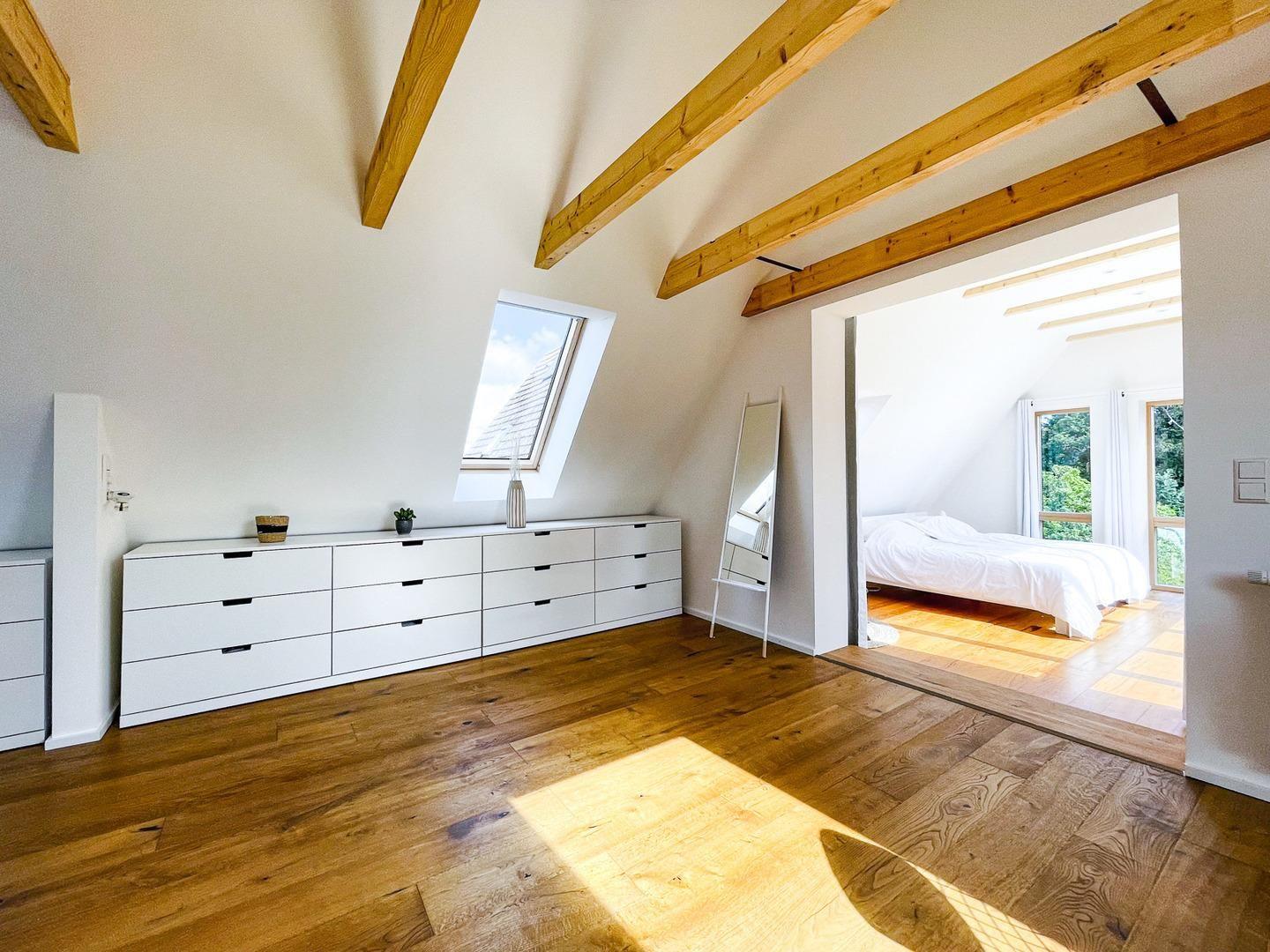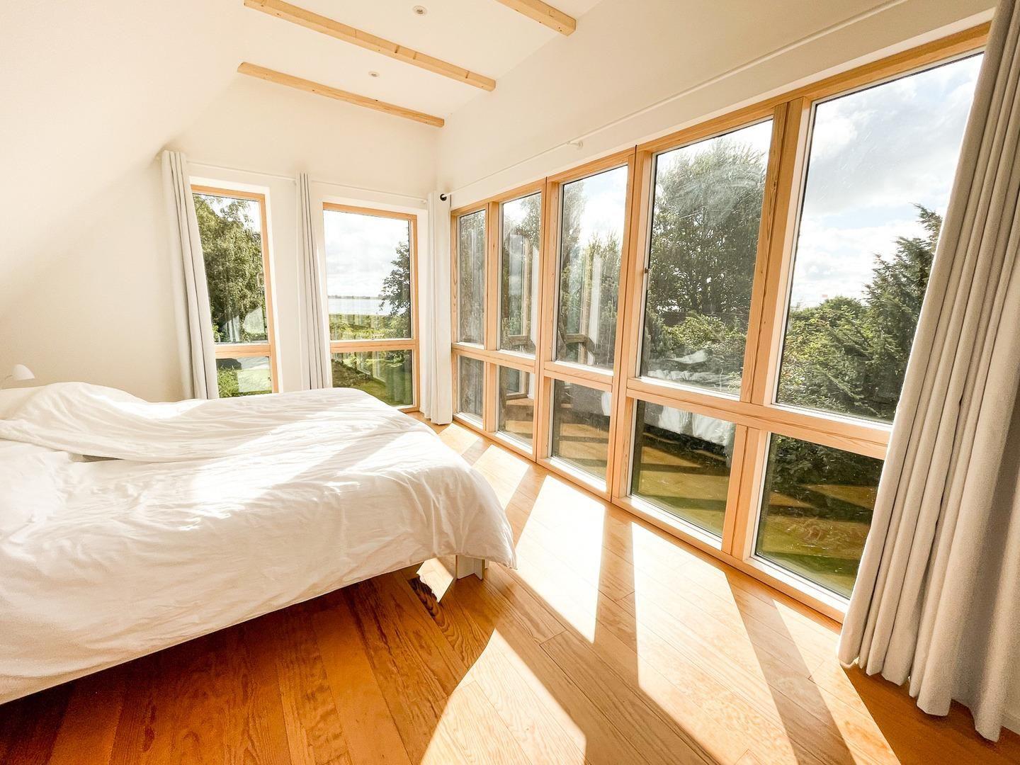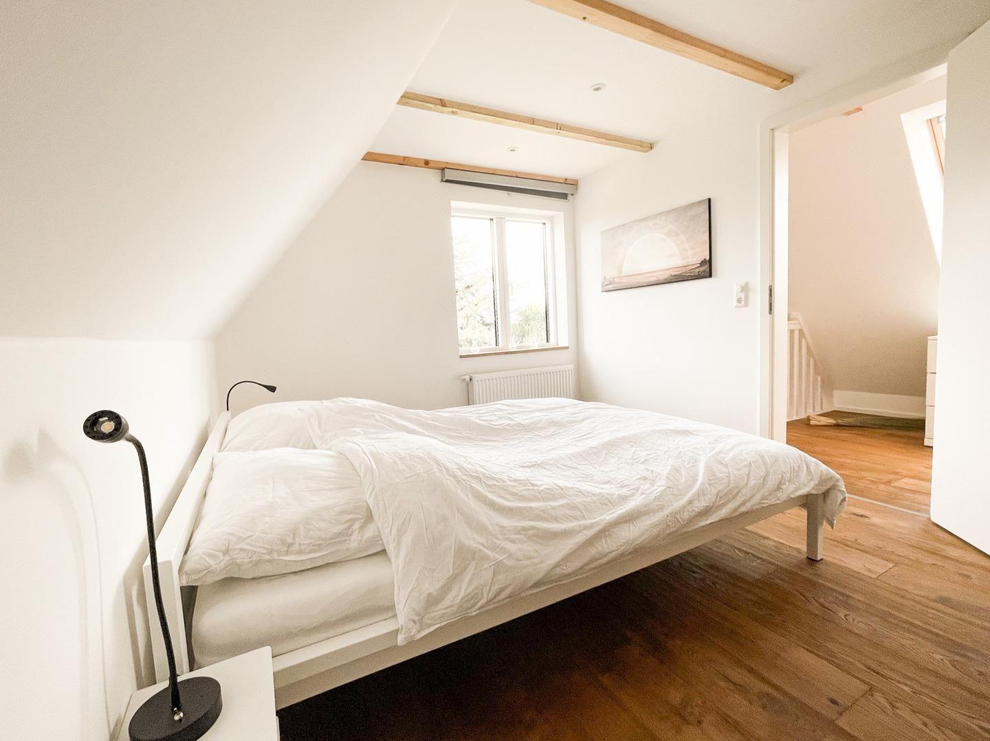Die beiden Schlafzimmer mit Doppelbetten befinden sich im Obergeschoss, eines davon bietet einen einmaligen Panoramablick auf die Ostsee mit seinen wunderschönen Sonnenaufgängen. Die offene Raumgestaltung des Erdgeschosses setzt sich im Obergeschoss fort. Der Blick geht durch die Räume hinaus auf Meer und Garten.