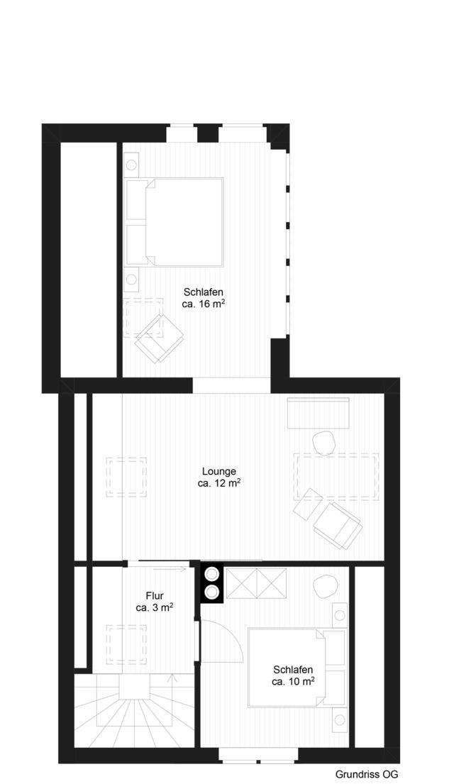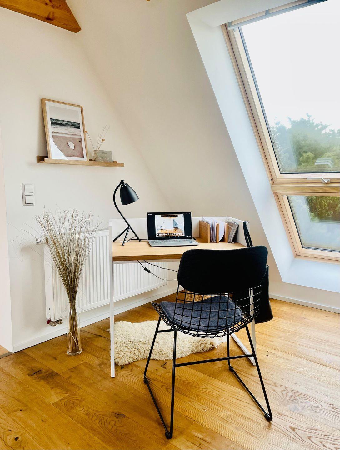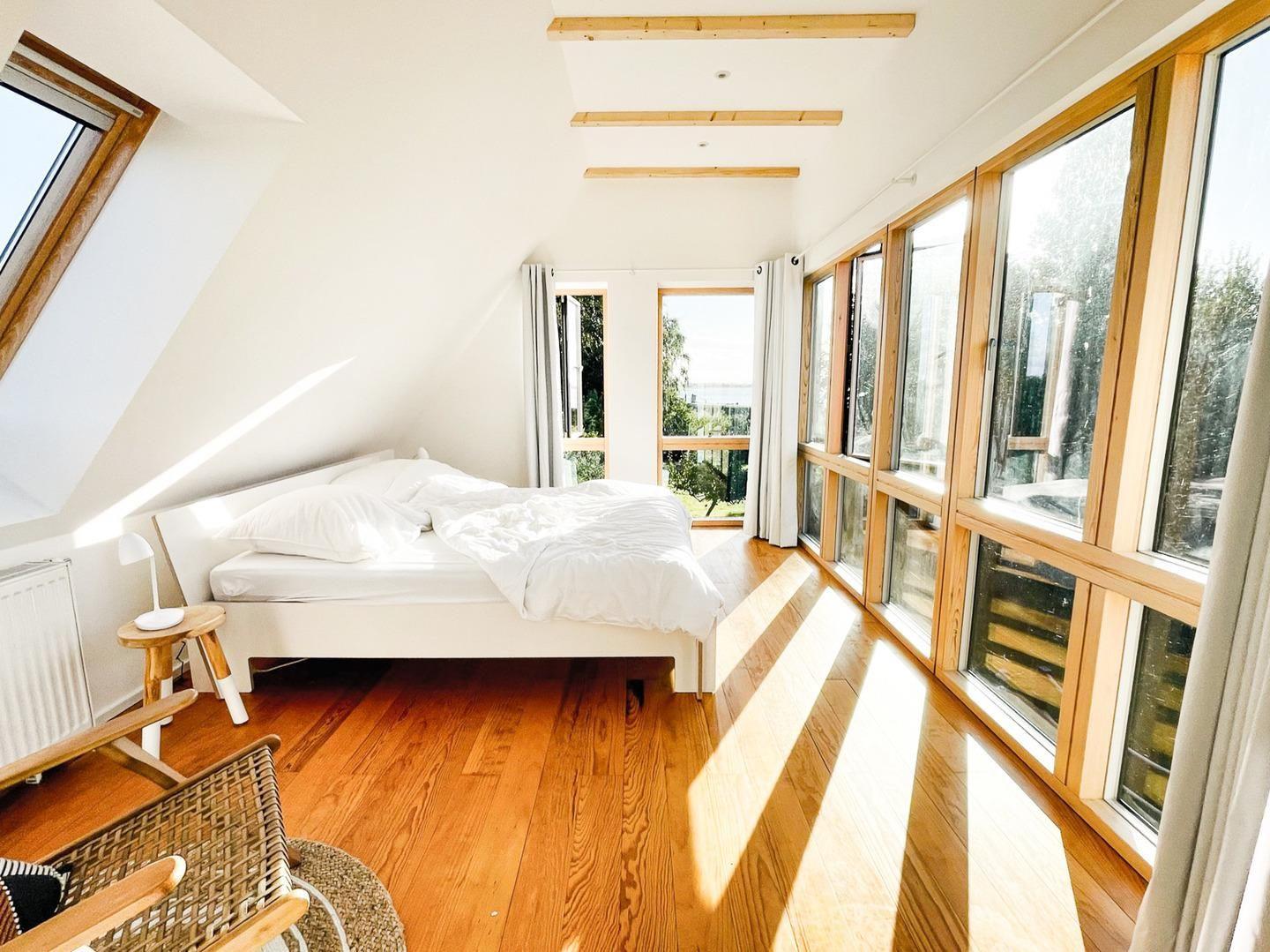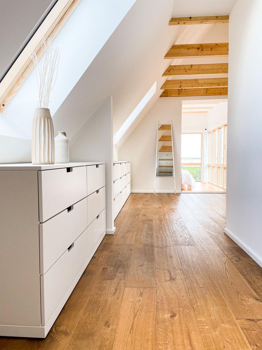 Die beiden Schlafzimmer mit Doppelbetten befinden sich im Obergeschoss, eines davon bietet einen einmaligen Panoramablick auf die Ostsee mit seinen wunderschönen Sonnenaufgängen. Die offene Raumgestaltung des Erdgeschosses setzt sich im Obergeschoss fort. Der Blick geht durch die Räume hinaus auf Meer und Garten.