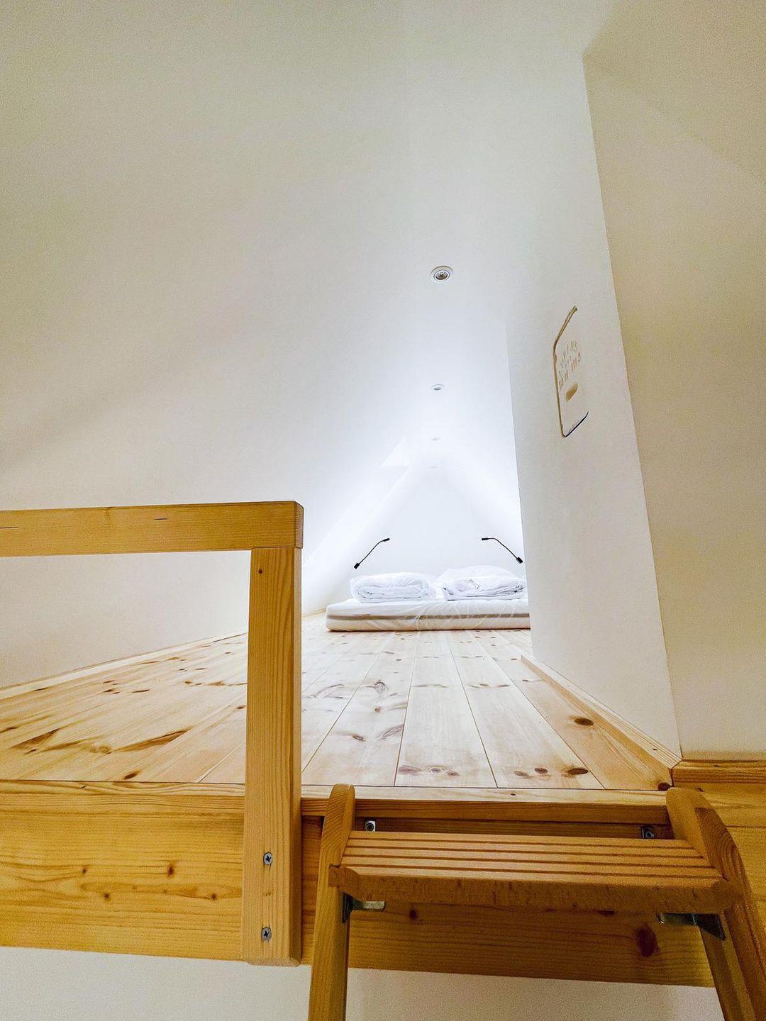Vom Loungezimmer lässt sich über eine Leiter die offene Schlafgalerie erreichen, die vor allem für Kinder ein "Platz unter den Sternen" ist.