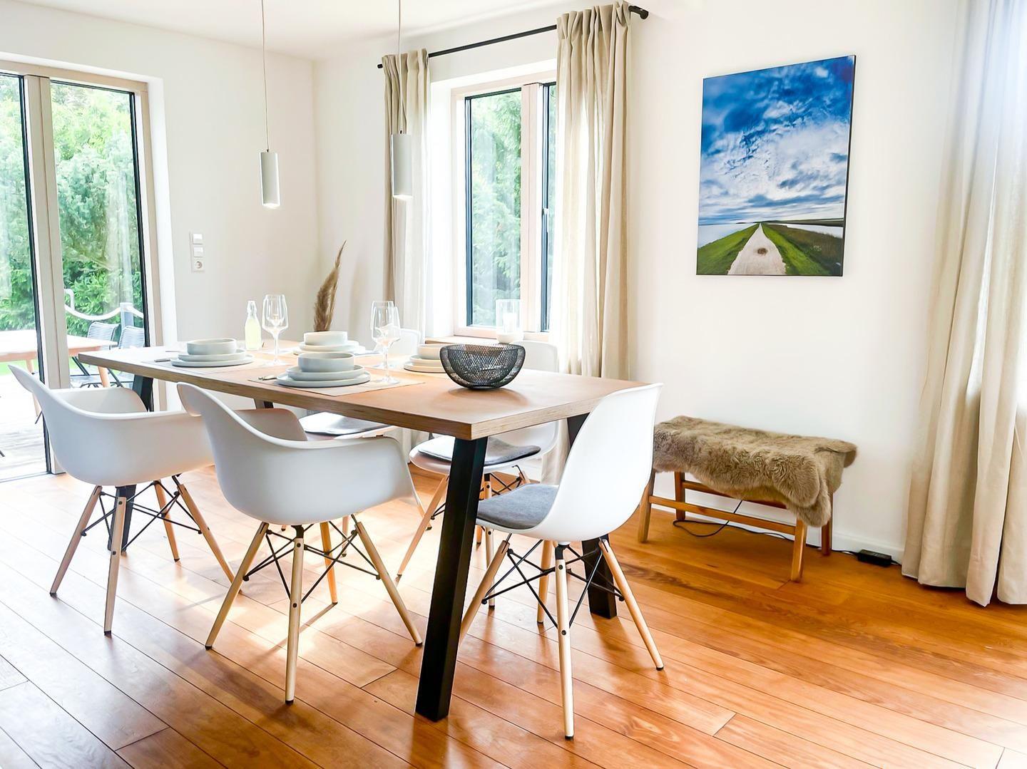 In der Küche findet Ihr alles, was Ihr zum Kochen und Backen benötigt. Der Esstisch ist groß genug für Familie und Freunde und im Wohnzimmer lassen sich vor dem Kamin gemütliche Stunden verbringen. Vom Esszimmer aus gelangen Sie direkt auf die große Terrasse mit Gasgrill und weiter in den Garten. Mit der stimmungsvollen Ambientebeleuchtung klingt der Abend nach einem schönen Tag am Meer wunderbar aus.