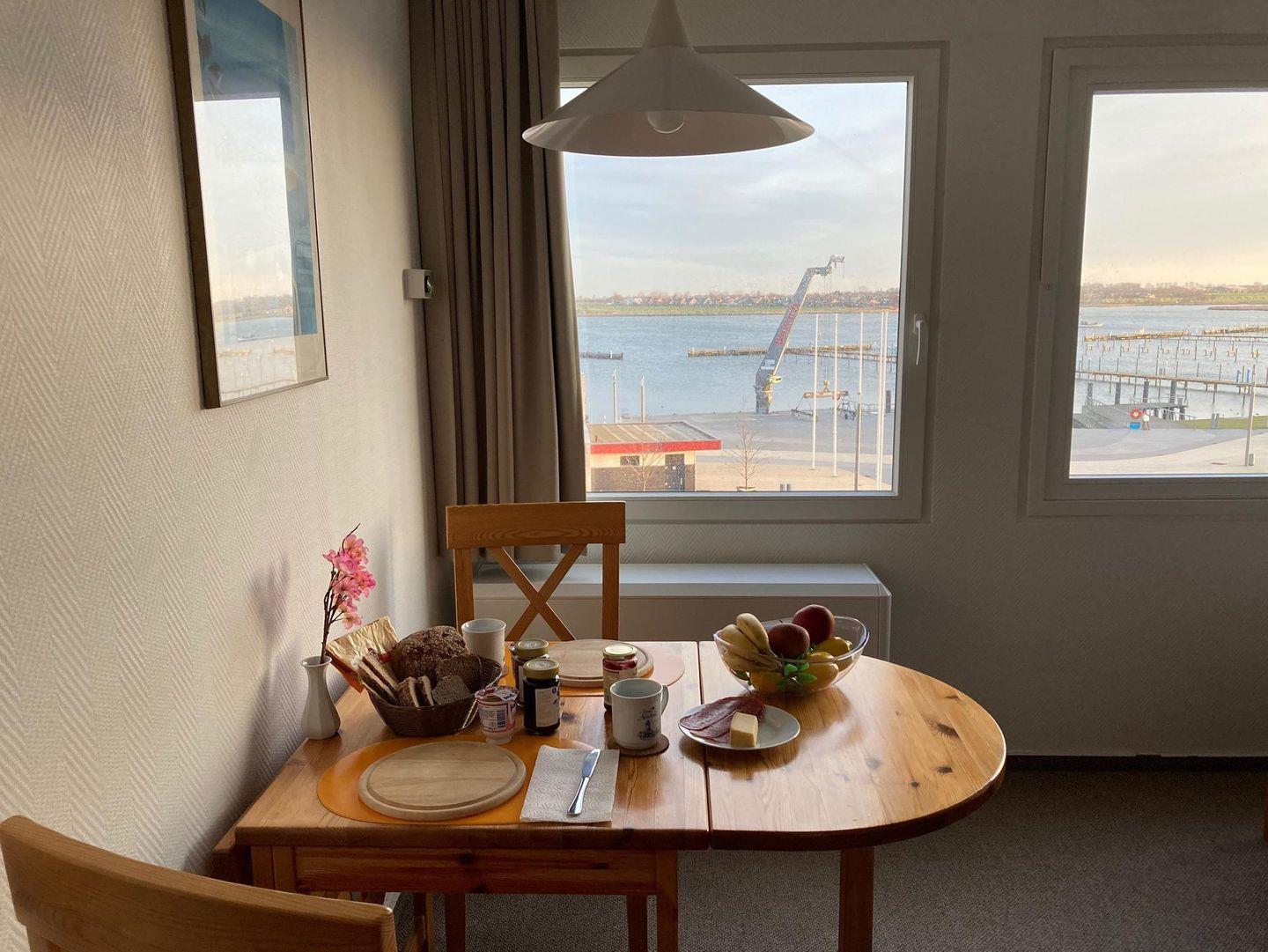 Gemütliches Studio mit Panoramablick am Yachthafen Burgtiefe auf Fehmarn, nur wenige Schritte vom Strand entfernt.