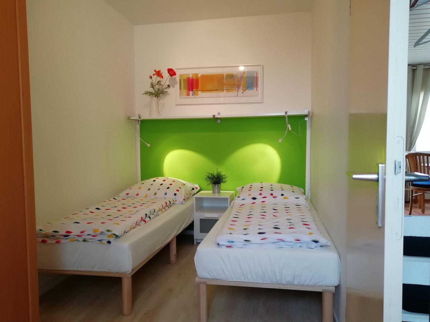 Der Wohn- und Schlafraum ist mit einem gemütlichen Schlafsofa (1,60x2,00) für 2 Personen und einem Esstisch für 4 Personen möbliert. Der Flachbildschirm, Radio/CD-Spieler, DVD-Spieler, Bücher und einige Gesellschaftsspiele bieten die Möglichkeit zur Entspannung. Der Schlafraum bietet 2 Einzelbetten 0,80x2,00m, die jedoch schnell zu einem Bett zusammengeschoben werden können. Ein großer Kleider schrank sorgt für Ordnung. Der kleine Klapptisch kann bei Bedarf für Scfhreibarbeiten oder den Laptop genutzt werden. Ein Kinderreisebett und ein Kinderhochstuhl stehen Ihnen kostenlos zur Verfügung. Die Pantray ist mit Ceranfeld (4Platten), Backofen, Spüle und Geschirrspüler ausgestattet. Die Kühl/Gefriekombination 40l hat ihren Platz direkt am Essplatz. Im Duschbad können die persönlichen Dinge in den Bademöbeln leicht untergebracht werden. Der zur Wohnung gehörende Stellplatz kann kostenlos genutzt werden. Das 2-Zimmer Appartement befindet sich im 4.Obergeschosss und bietet einen tollen Ausblick auf den Yachthafen von Burgtiefe, den Binnensee und die Insel.