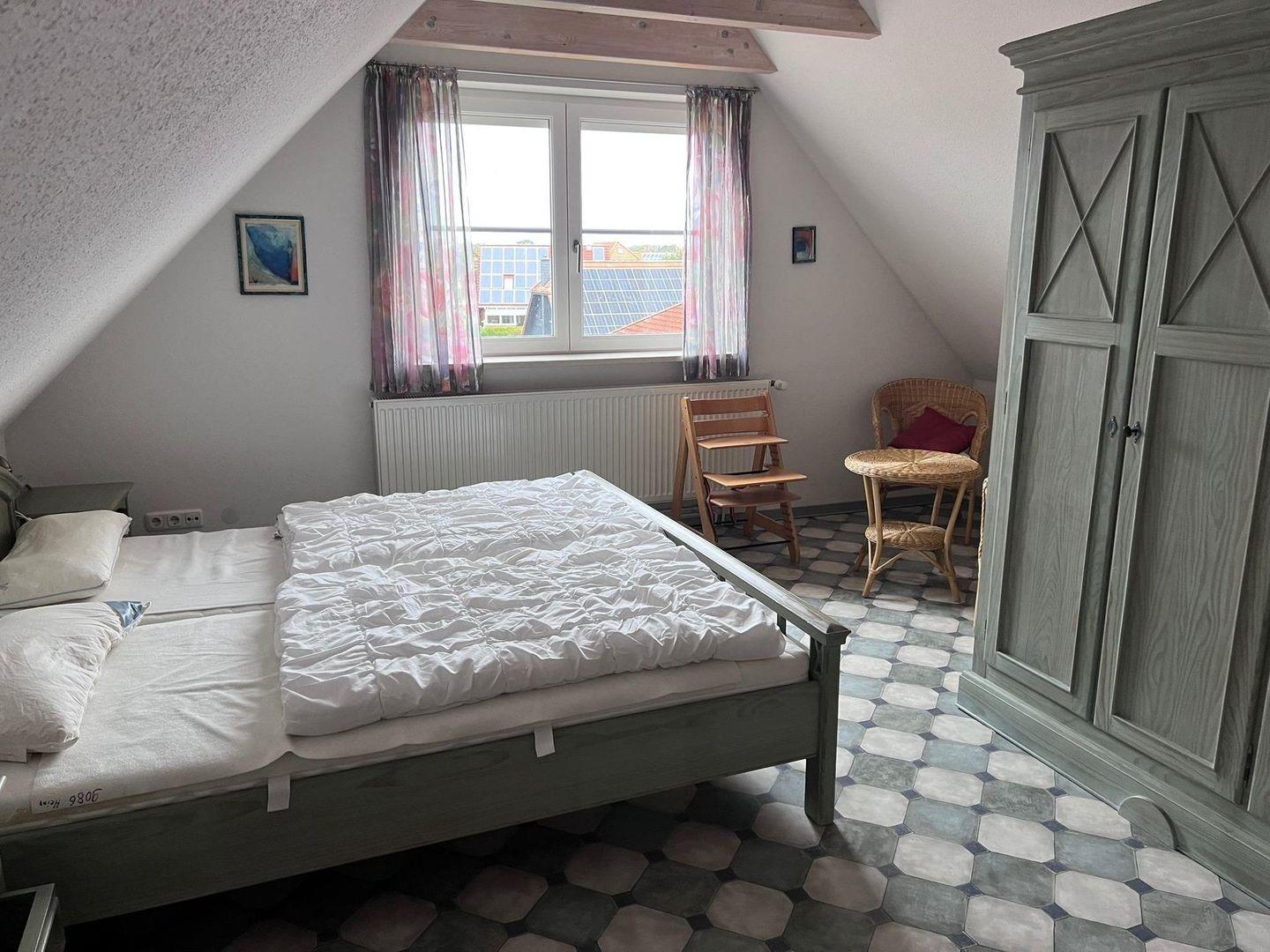 Ein Schlafzimmer hat direkten Zugang zum Bad mit Dusche, Badewanne und WC. Das zweite Schlafzimmer ist in der oberen Etage mit einem 3.Bett. Es steht im Giebelbereich und ist deshalb eher für Kinder geeignet.
