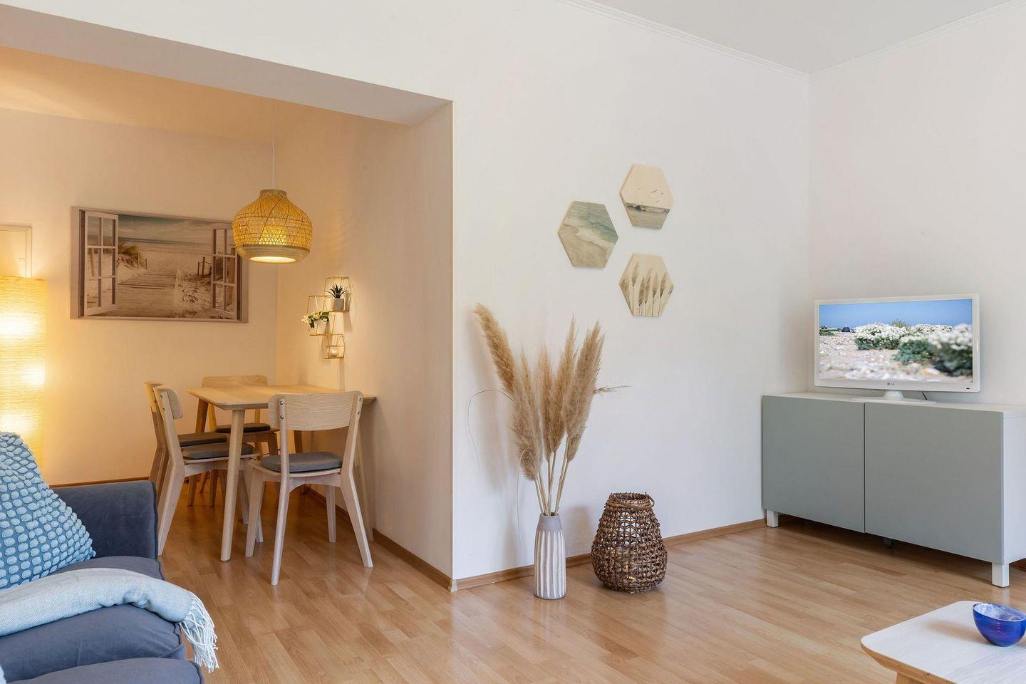 Ein geschmackvoll eingerichtetes Wohnzimmer mit gemütlicher Couch und TV, Kostenloses WLAN, das Schlafzimmer mit großem Doppelbett, ein Kinderzimmer mit Etagenbett, eine separate Küche mit Herd, Backofen, Kühlschrank, Kaffeemaschine und allen notwendigen Küchenutensilien, sowie ein modernes Bad mit Dusche. Außerdem haben Sie eine eigene Terrasse mit eigenem Garten, indem Sie die Sonnenstunden genießen können.