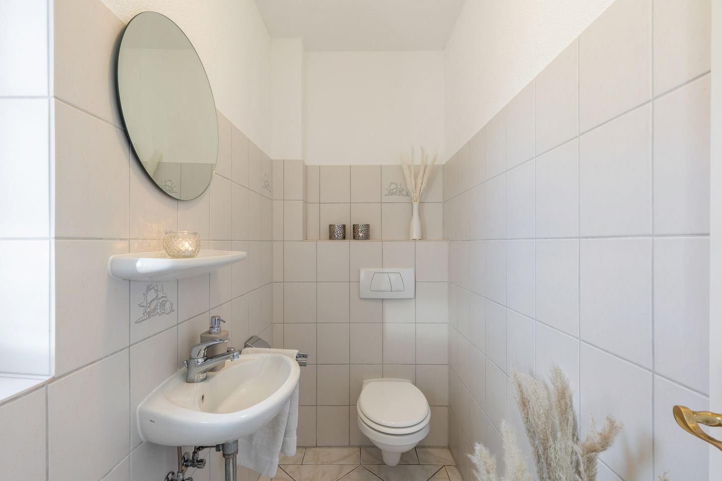 Das Herzstück des Hauses ist das gemütliche Wohnzimmer, das mit einem großen über 55 Zoll Fernseher, einer HiFi-Anlage und einem komfortablen Sofa ausgestattet ist. Die hellen Fenster sorgen für einen einladenden Lichtstrom und bieten einen Blick auf die grüne Umgebung. Ganz gleich, ob Sie sich nach einem langen Tag entspannen oder gemeinsam Zeit verbringen möchten, dieses Zimmer bietet den idealen Rahmen.