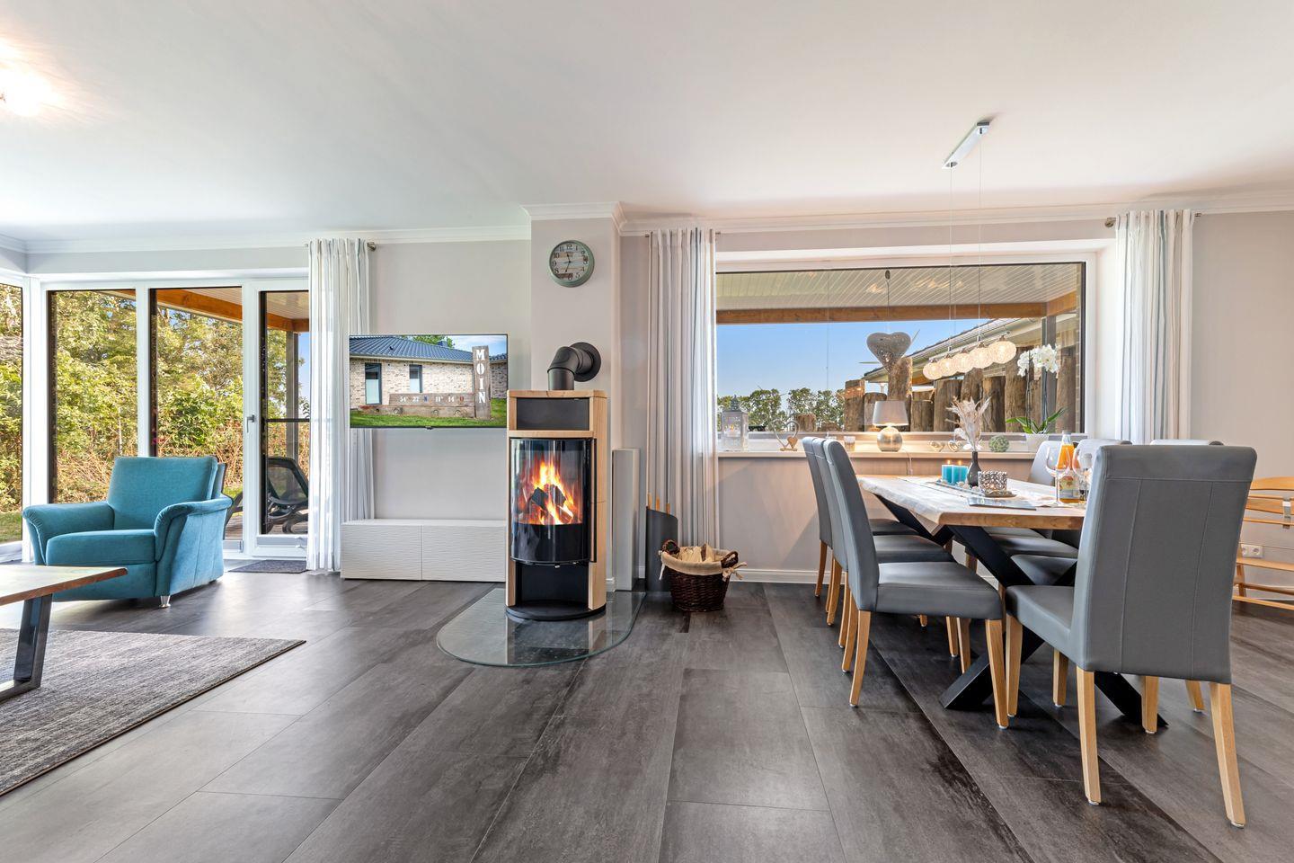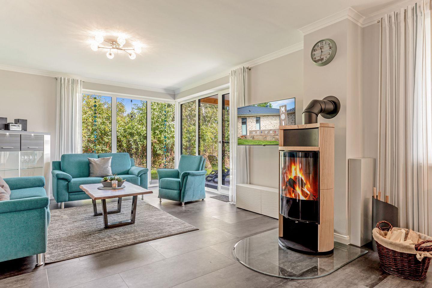 Die drei gemütlichen Schlafzimmer sind mit hochwertigen Vinylböden ausgestattet und bieten Ihnen einen angenehmen Rückzugsort. Das offene Wohnzimmer mit einer Sofaecke und einem modernem Kaminofen lädt zu entspannten Abenden ein. Genießen Sie die gemeinsame Zeit mit Ihren Liebsten am großen Esstisch, während Sie die Aussicht in den Garten erhaschen. Die gut ausgestattete Küche lässt keine Wünsche offen – von einer Spülmaschine über eine Mikrowelle bis hin zu einer Kaffeemaschine finden Sie alles, was Sie brauchen, um sich kulinarisch verwöhnen zu lassen.