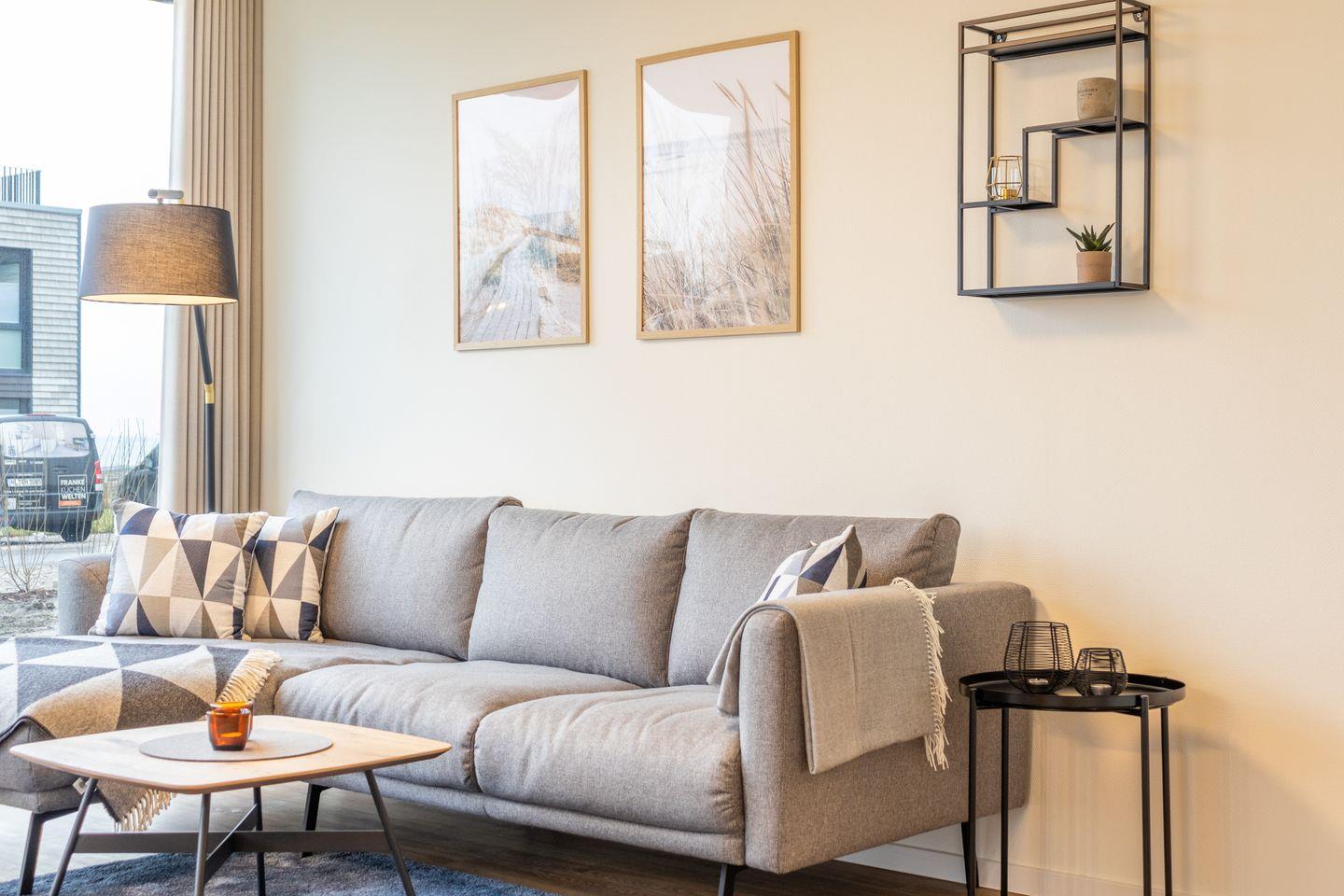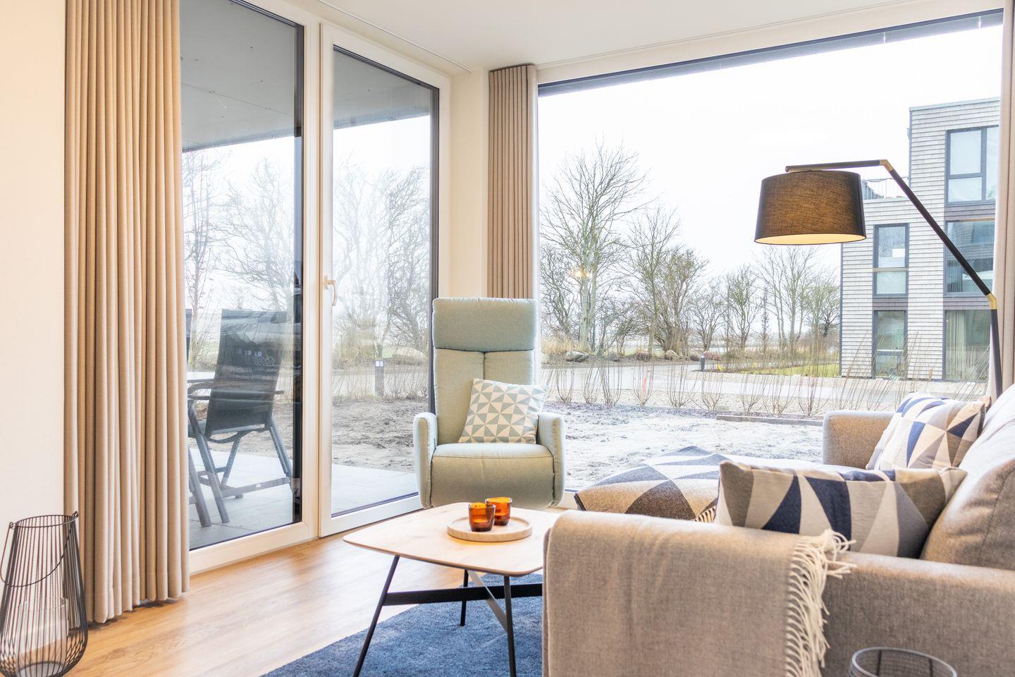 Der lichtdurchflutete Wohnbereich kombiniert dezente Naturtöne mit hochwertigen Materialien. Bodentiefe Fenster öffnen den Blick zur Terrasse und in den Garten. Ein Relaxsessel, ein großer Smart-TV und die offene Küche mit Markengeräten schaffen die perfekte Umgebung für entspannte Stunden. Der Essbereich lädt zu gemeinsamen Mahlzeiten ein – drinnen oder draußen mit Blick auf die Ostsee.