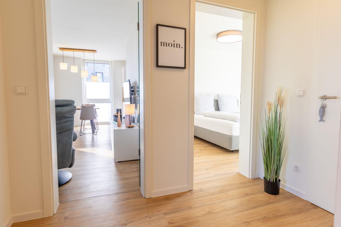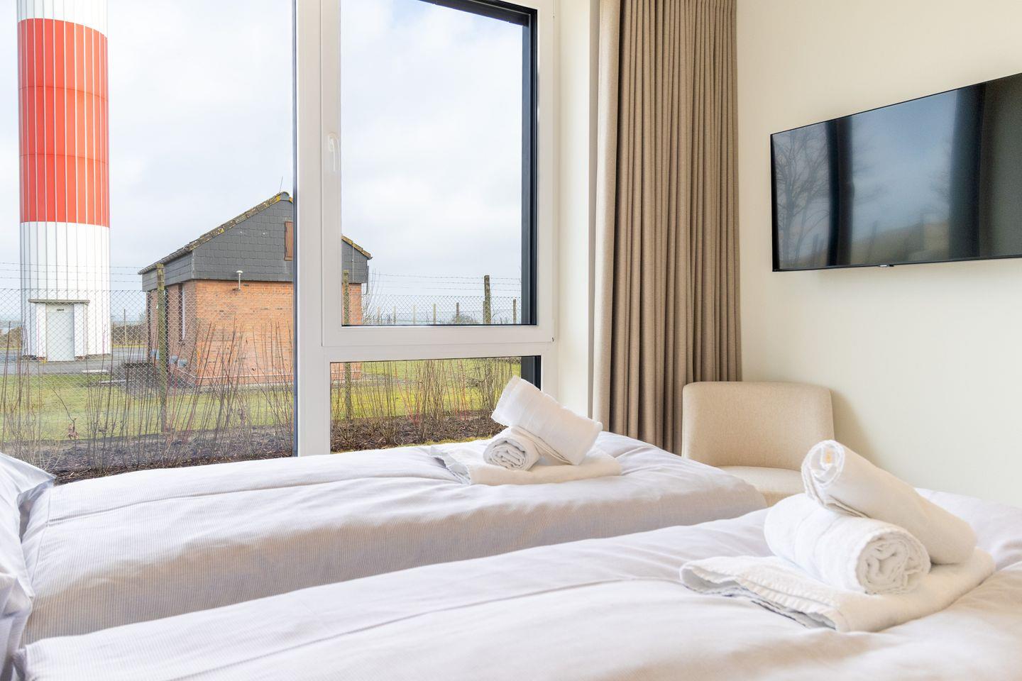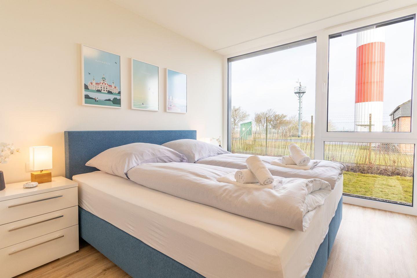 Zwei gemütliche Schlafzimmer mit Boxspringbetten versprechen erholsame Nächte. Im Hauptschlafzimmer wartet zusätzlich ein TV auf dich. Die ruhige Lage und das helle, klare Design sorgen für eine entspannte Atmosphäre.