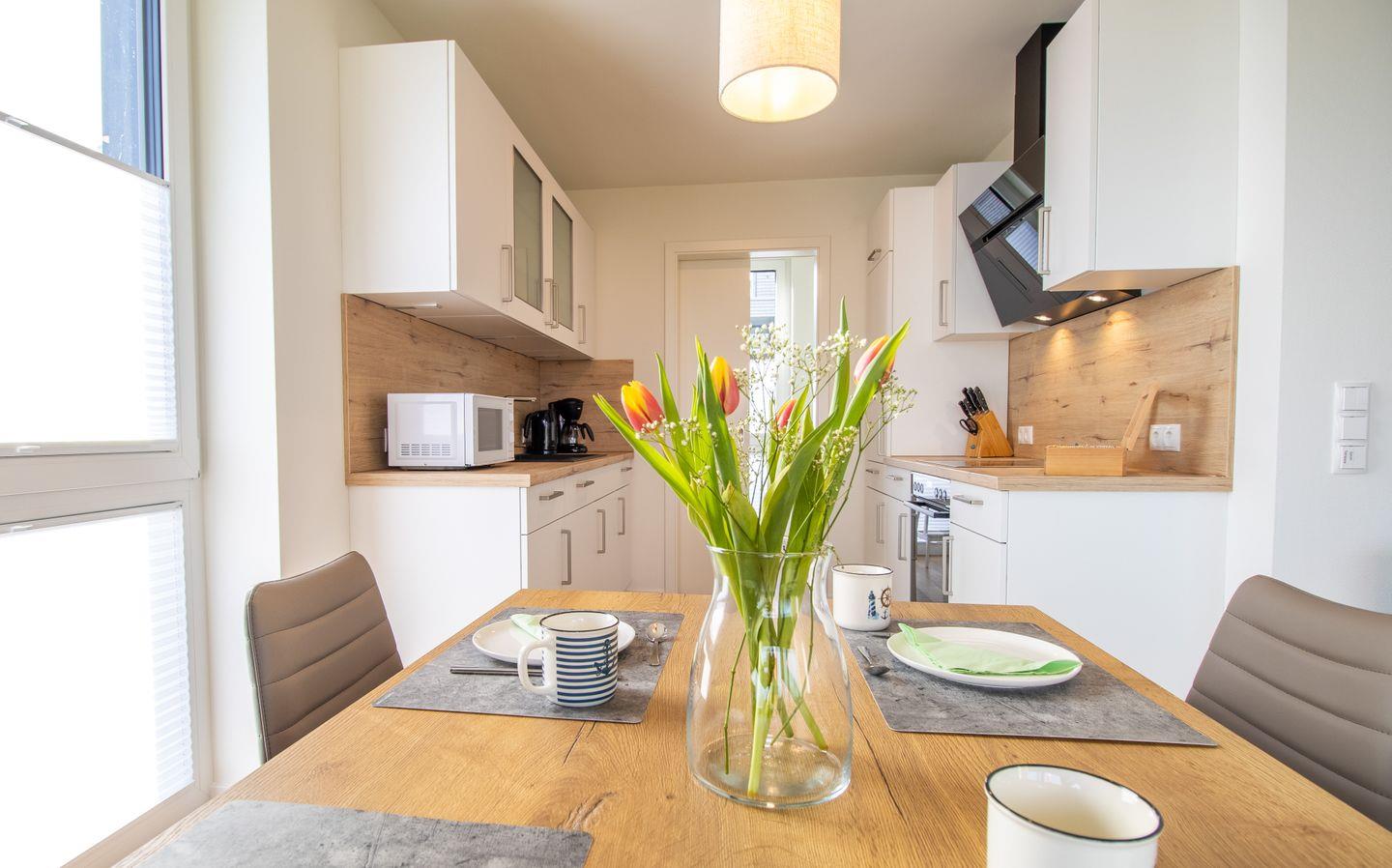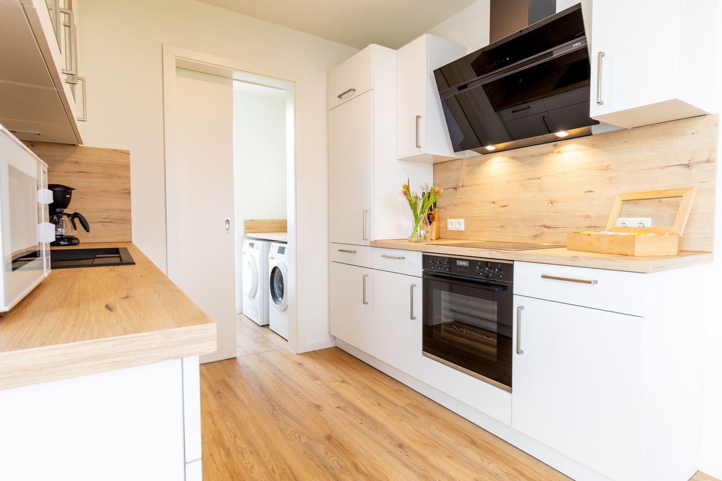 Im offenen Wohnbereich mit bodentiefen Fenstern genießt du Licht, Luft und Meerblick – ob auf dem gemütlichen Relaxsessel oder beim Frühstück auf der überdachten Terrasse. Die offene Küche ist mit Miele-Geräten voll ausgestattet und lädt zum gemeinsamen Kochen ein. Waschmaschine und Trockner sorgen für zusätzlichen Komfort.