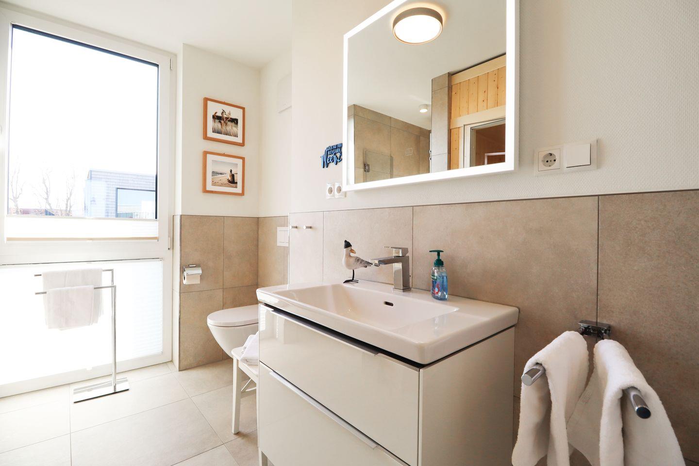 Deine eigene Sauna und eine großzügige, bodengleiche Dusche machen das Bad zu deinem persönlichen Spa. Entspanne nach einem Strandtag oder genieße einfach ruhige Stunden bei wohliger Wärme – mit viel Licht und Raum für Erholung.