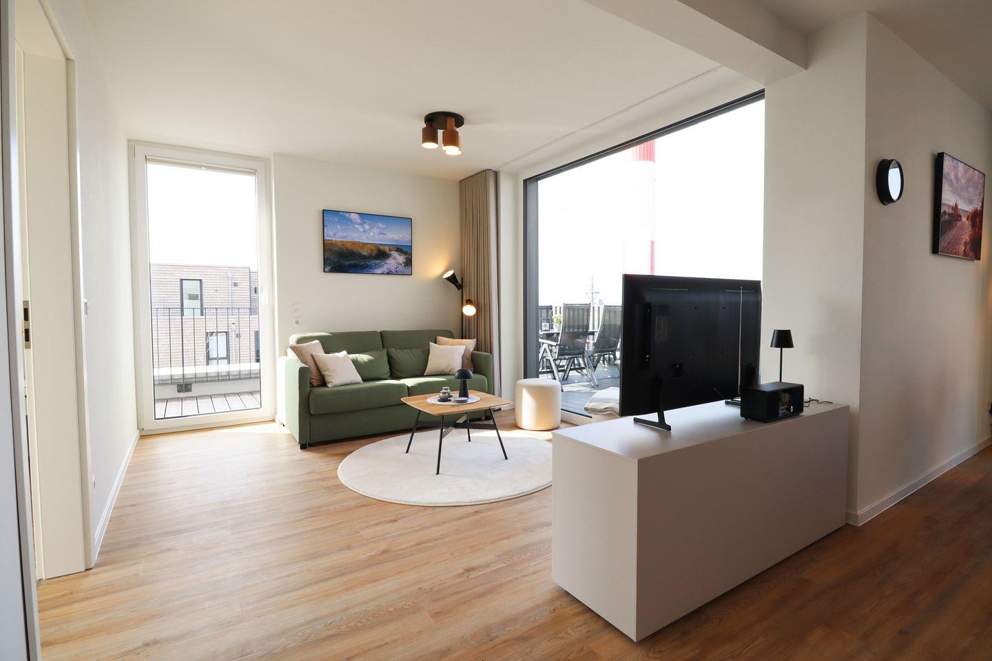 Der offene Wohnbereich mit bodentiefen Fenstern ist hell, modern und stilvoll eingerichtet. Warme Farben und hochwertige Materialien sorgen für eine gemütliche Atmosphäre. Die Küche ist voll ausgestattet mit Markengeräten – perfekt für gemeinsame Abende mit Ostseeblick. Das Herzstück: die weitläufige Dachterrasse mit Panorama-Meerblick.