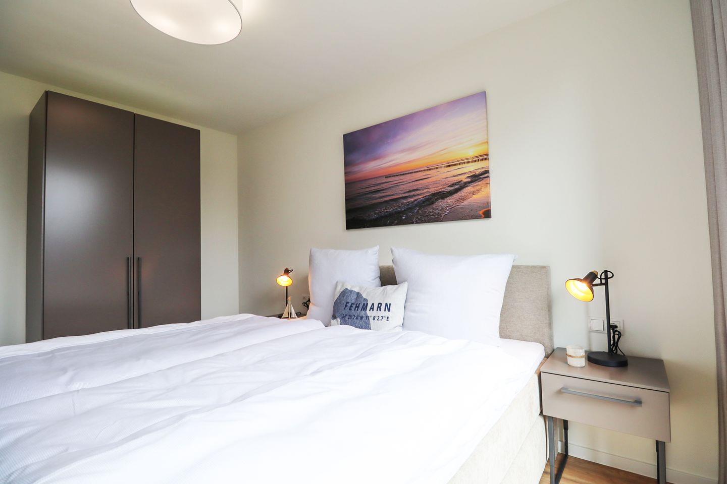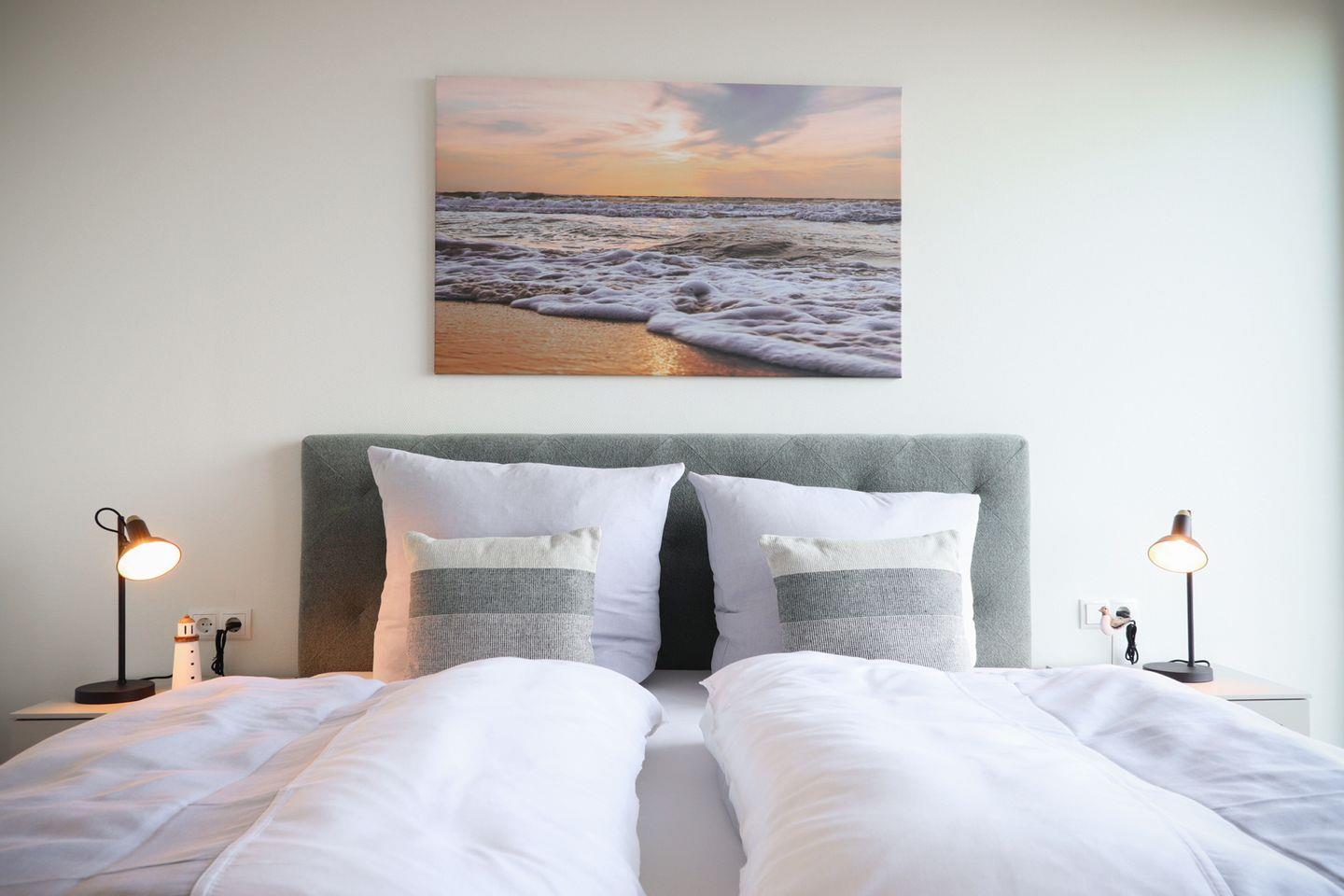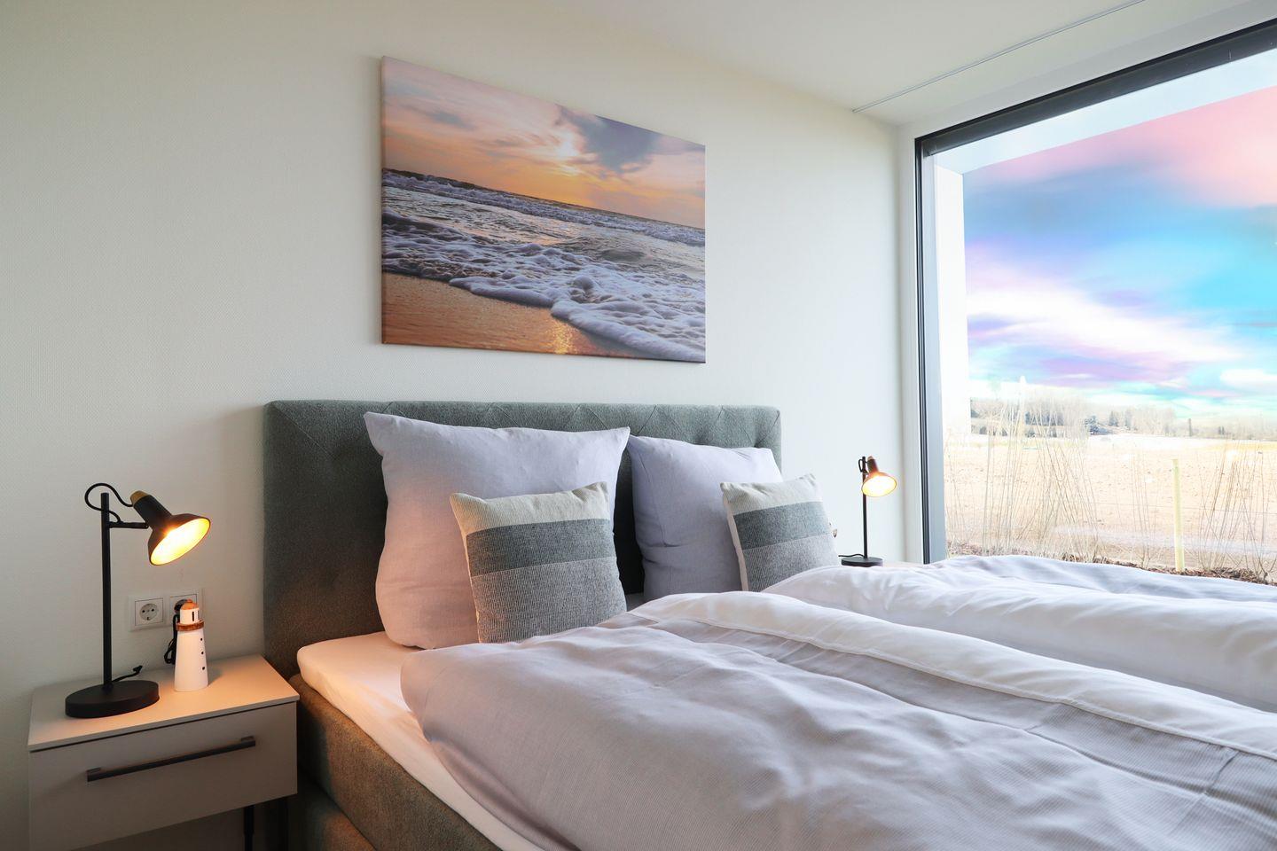In beiden Schlafzimmern sorgen hochwertige Boxspringbetten für höchsten Schlafkomfort. Große Fenster durchfluten die Räume mit Tageslicht, während stilvolle Verdunklungsvorhänge für angenehme Ruhe in der Nacht sorgen. Eines der Schlafzimmer bietet dir sogar direkten Blick aufs Meer – ein wunderbarer Start in den Tag. Die klare Gestaltung und die harmonische Farbgebung schaffen eine Umgebung zum Abschalten und Auftanken.