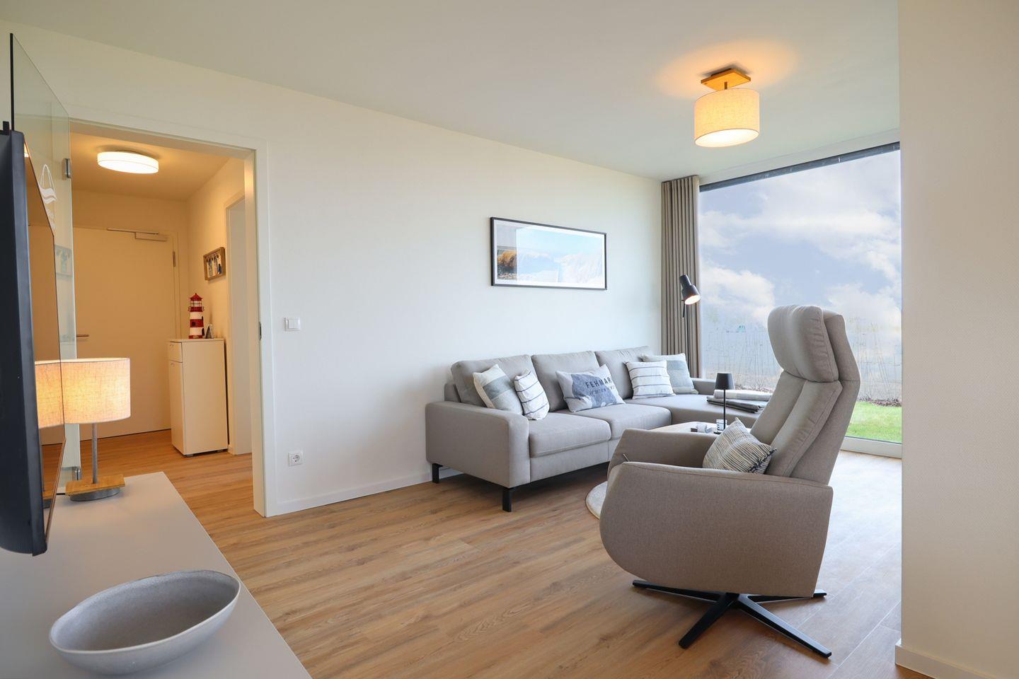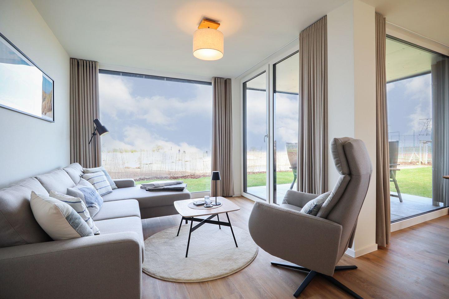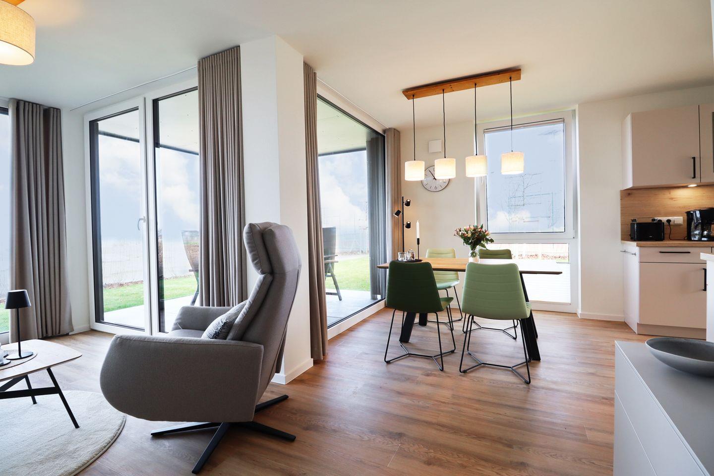 Der offene Wohnbereich lädt mit seiner klaren, zurückhaltenden Einrichtung zum Entspannen ein. Bodentiefe Fenster bringen Licht und Weite in den Raum, während das moderne Design für eine ruhige Atmosphäre sorgt. Die offene Küche ist komplett ausgestattet und bietet beste Voraussetzungen für gemeinsames Kochen. Vom Wohnraum gelangst du direkt auf die überdachte Terrasse, die mit ihrem unverbauten Meerblick ein echtes Highlight ist. Der angrenzende Gartenbereich gibt dir zusätzlichen Raum zur Erholung im Freien.
