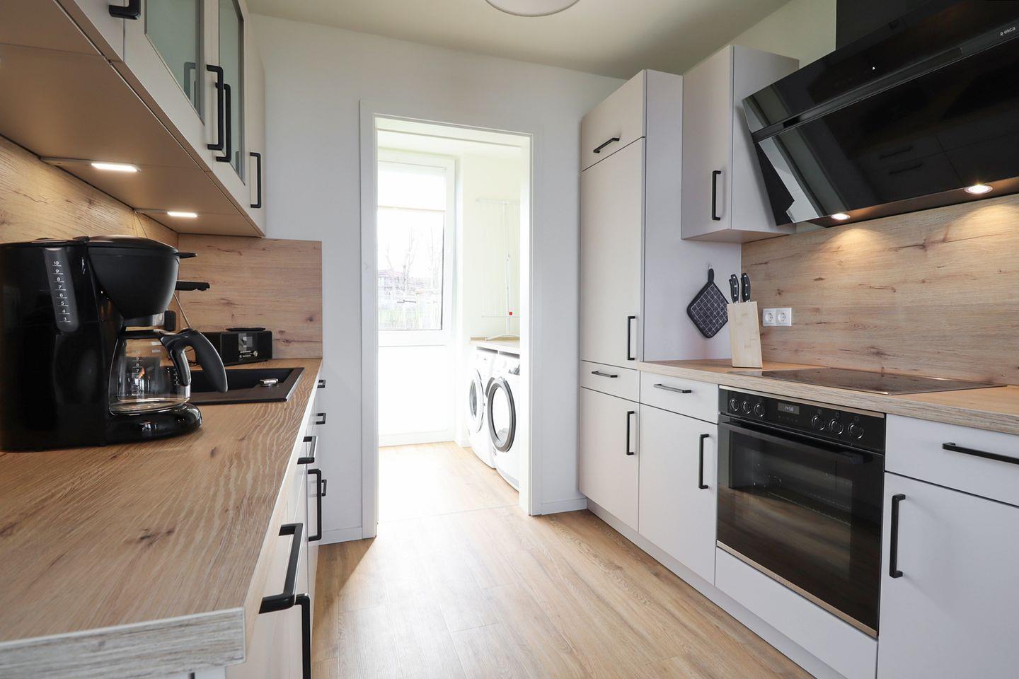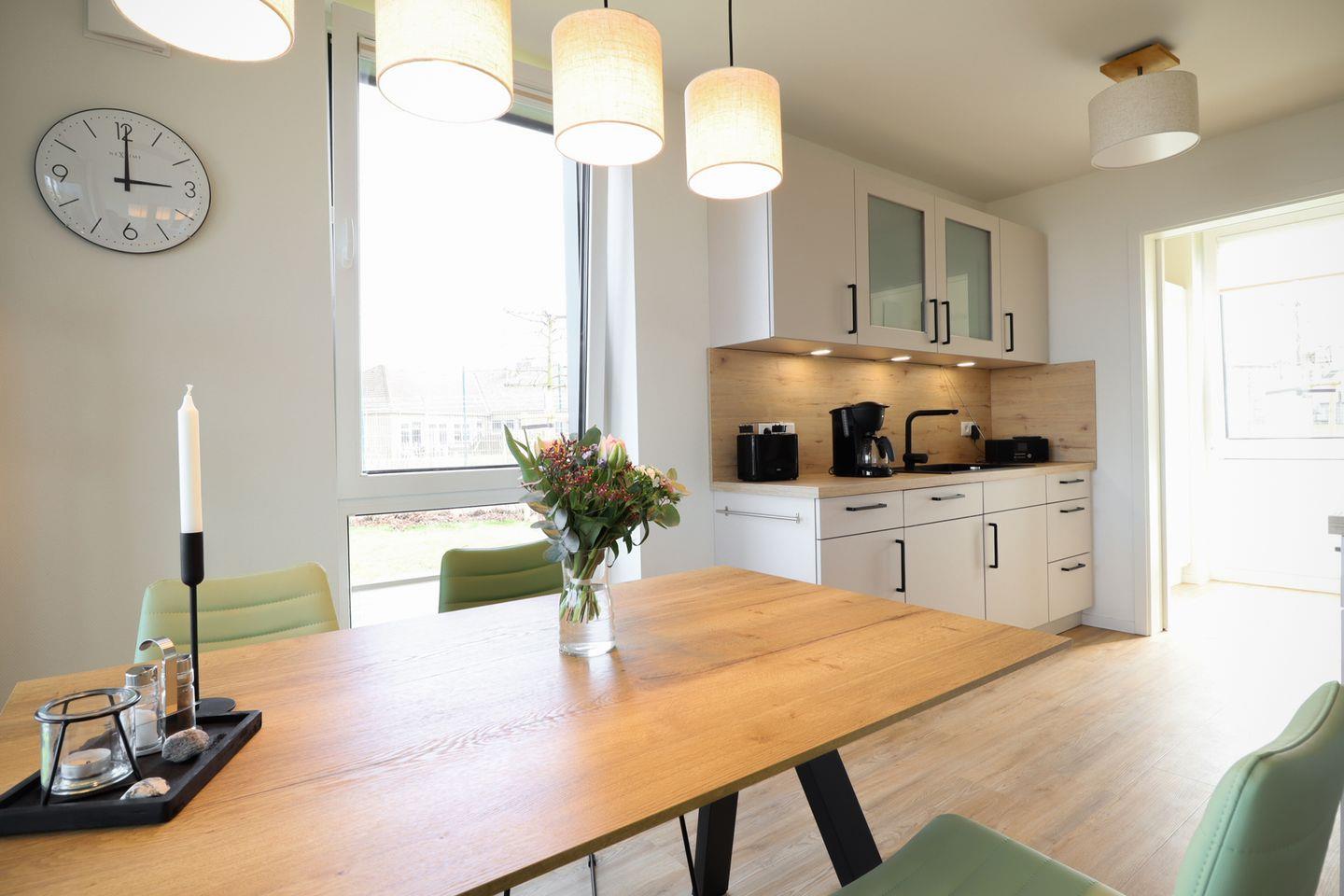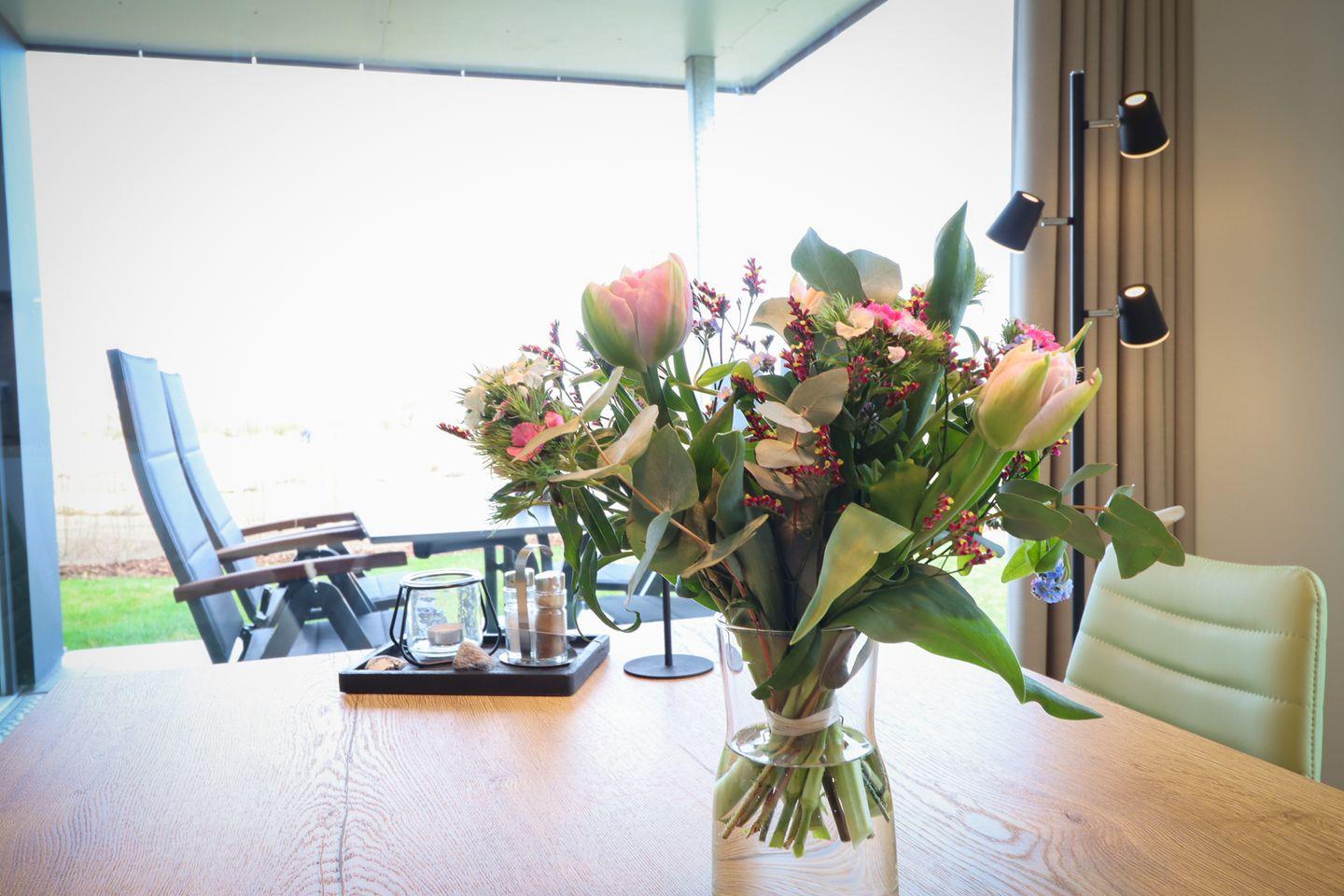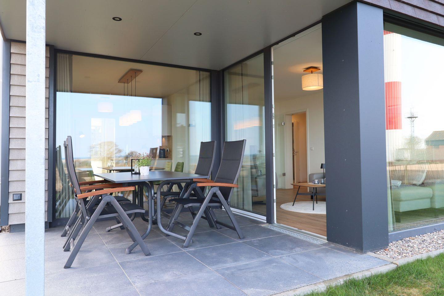 Der offene Wohnbereich lädt mit seiner klaren, zurückhaltenden Einrichtung zum Entspannen ein. Bodentiefe Fenster bringen Licht und Weite in den Raum, während das moderne Design für eine ruhige Atmosphäre sorgt. Die offene Küche ist komplett ausgestattet und bietet beste Voraussetzungen für gemeinsames Kochen. Vom Wohnraum gelangst du direkt auf die überdachte Terrasse, die mit ihrem unverbauten Meerblick ein echtes Highlight ist. Der angrenzende Gartenbereich gibt dir zusätzlichen Raum zur Erholung im Freien.