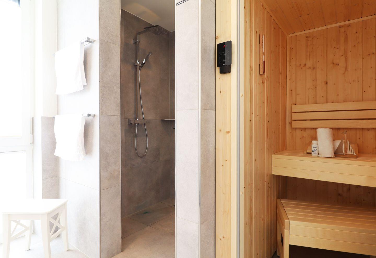 Das moderne Bad mit Tageslicht wird zur persönlichen Wohlfühloase. In der privaten Sauna findest du Ruhe und Erholung – egal, ob nach einem aktiven Tag auf der Insel oder einfach zum Innehalten zwischendurch. Die bodentiefe Dusche, der stilvolle Waschtisch und ein hochwertiger Spiegel mit Beleuchtung vervollständigen das entspannte Ambiente. Hier kannst du abschalten und dich ganz auf dich selbst konzentrieren.