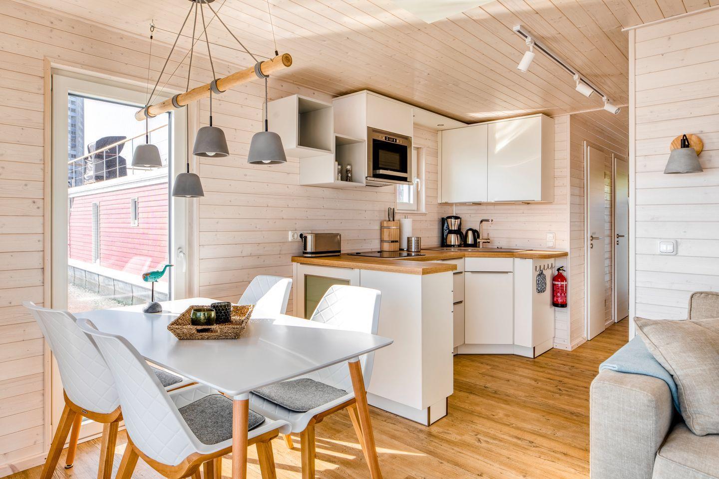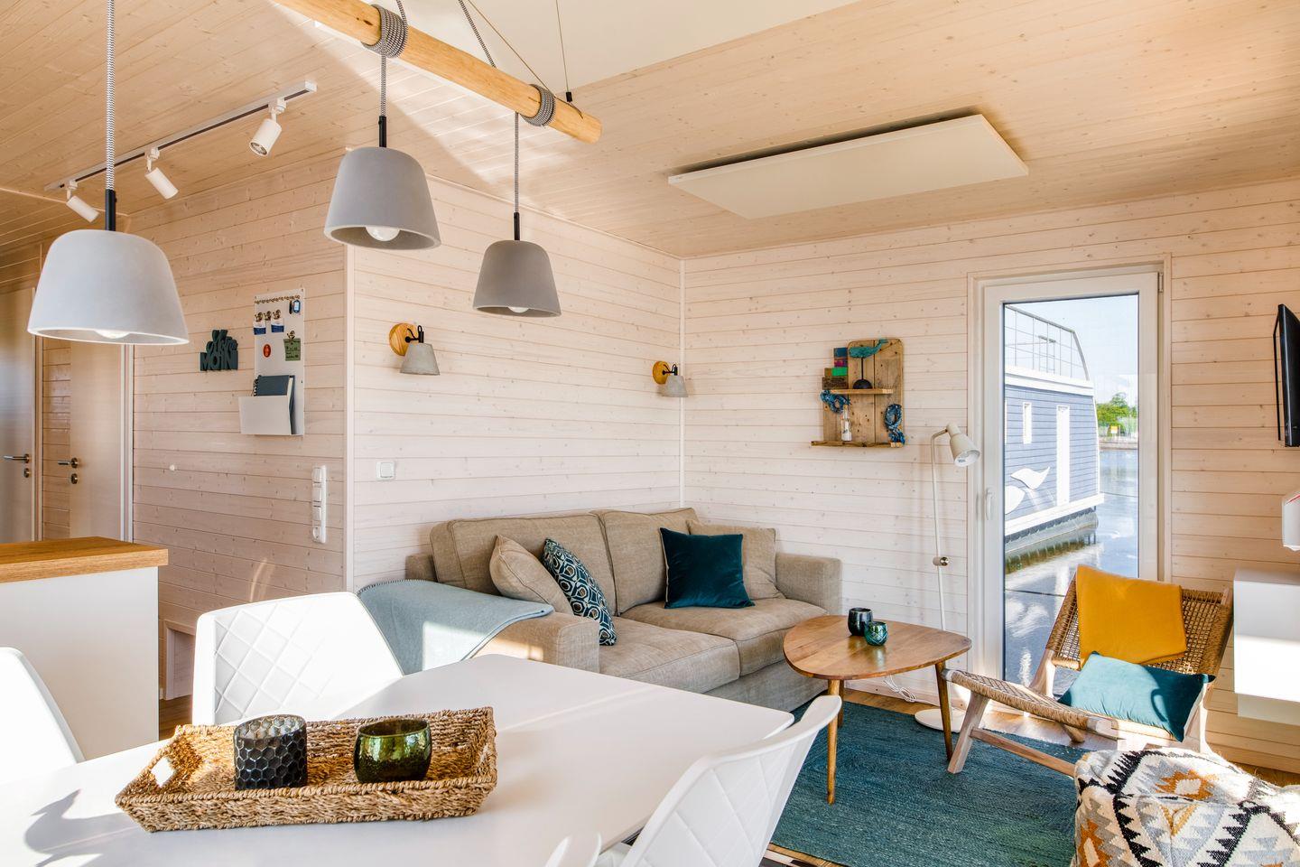 Auf rund 32 m² bietet die "TreibGut" Ihnen gemütliche Räume für entspannte Tage auf dem Wasser. Der offene Wohnbereich lädt zum Verweilen, Genießen, Treibenlassen und zum Blick aufs Wasser ein – ob beim Essen, Lesen oder einfach nur beim Ausruhen. Auch Ihr Hund ist in dieser Unterkunft herzlich willkommen.