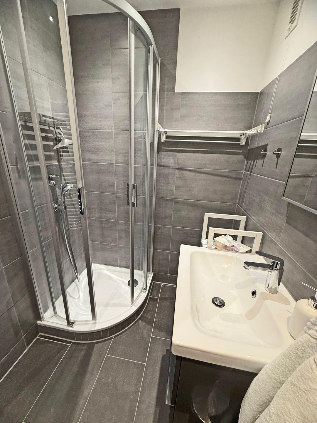 Waschbecken, Spiegelschrank, Dusche, WC, gute Beleuchtung, Fön