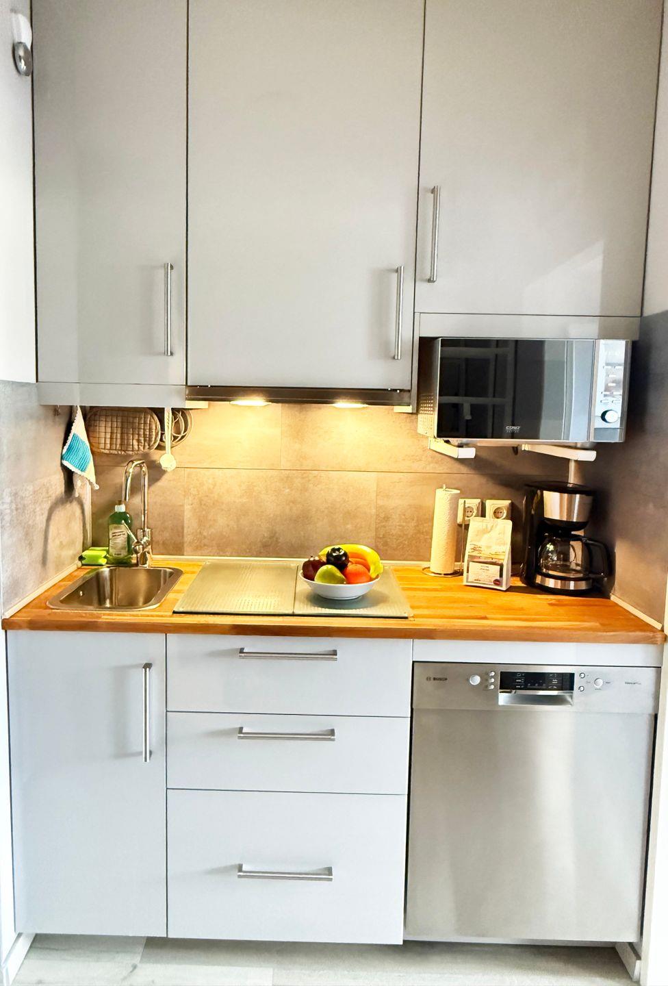 Toaster, Besteck, Kochfeld, Küchenzeile, Gefrierfach, Geschirr, Kühlschrank, Kochtöpfe, Filterkaffeemaschine, Mikrowelle, Wasserkocher